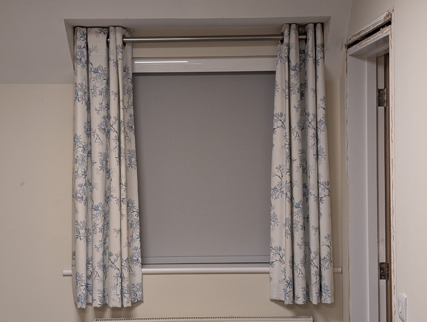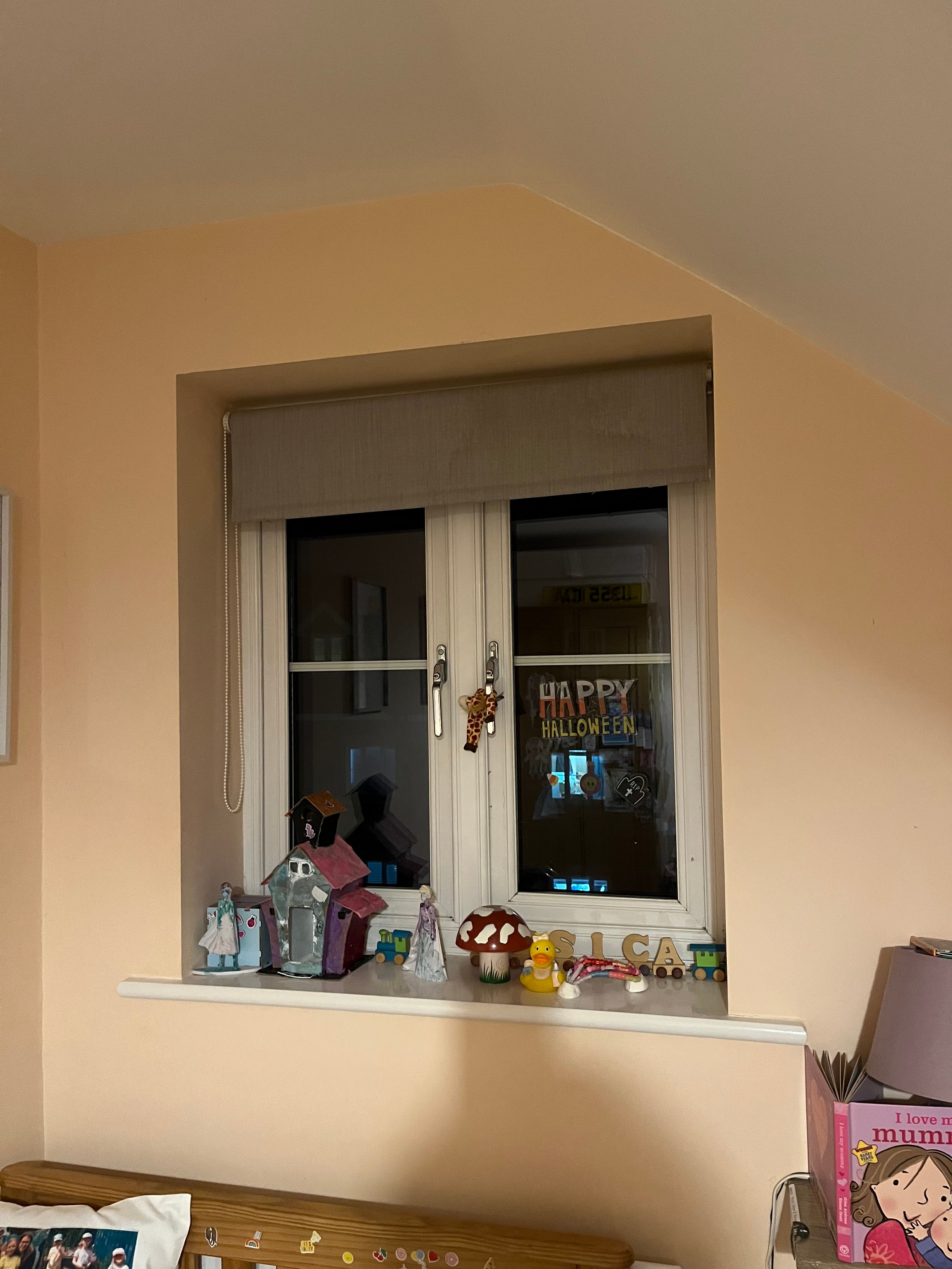 Daughter’s bedroom window lacks the space for a traditional curtain pole (some bugger put the roof in the way), so she’s slumming it with a roller blind. It does almost nothing for light, warmth etc. and flaps around with window open in the summer.