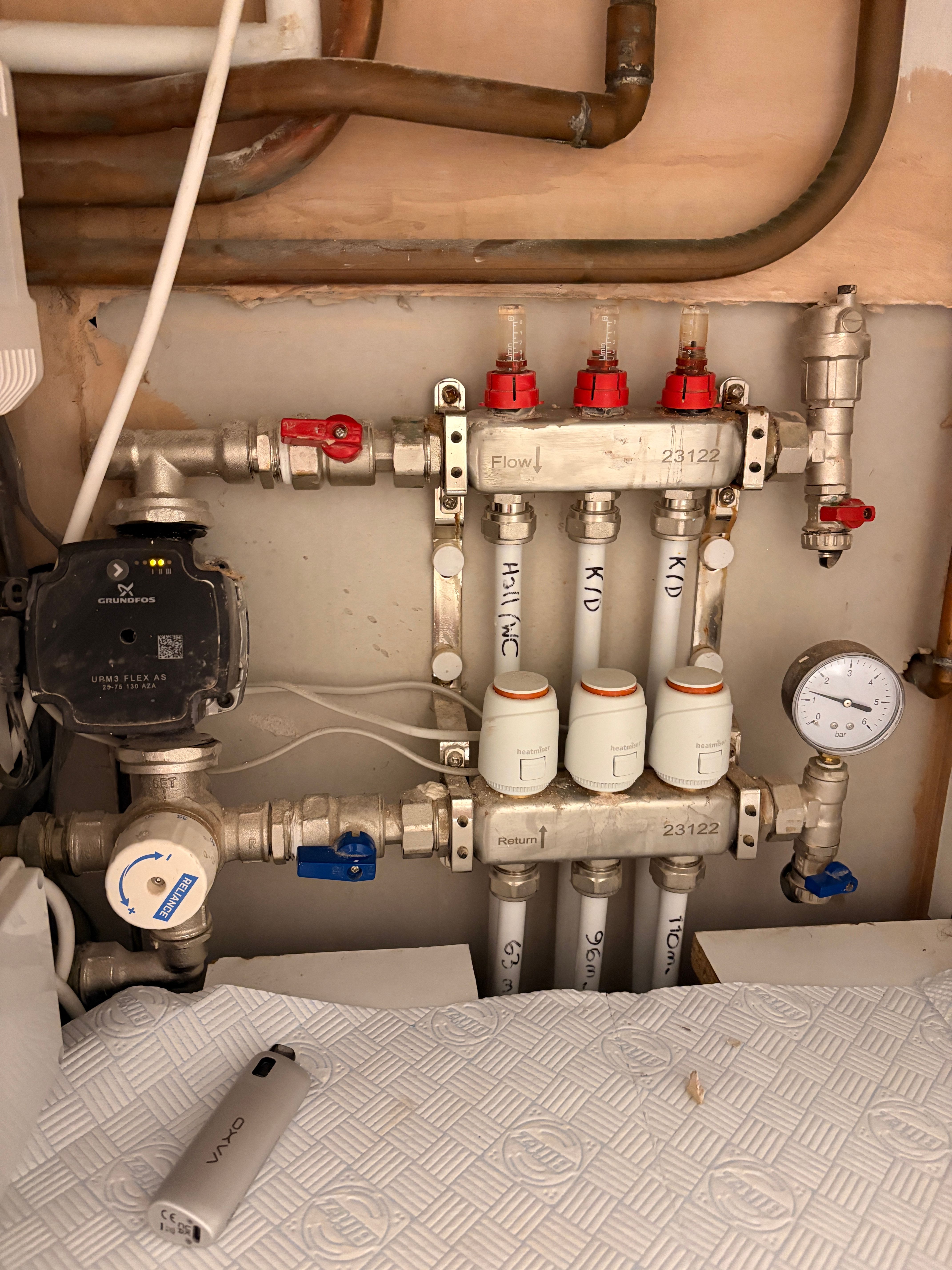 For a quick status check of my UFH I can feel the 2 flow and return pipes on the hall cupboard as the flow pipe will be very warm and the return just warm.