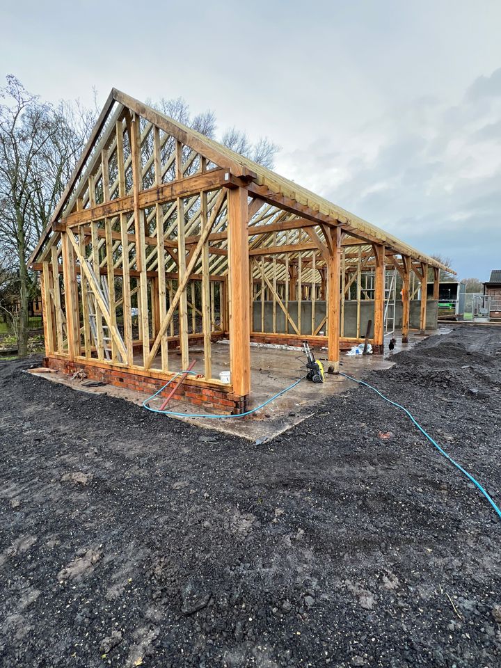 Softwood sole & top plate, softwood posts, softwood curved braces, softwood infill stud work @ 600 centres & softwood tie beams to the rear & side elevations.