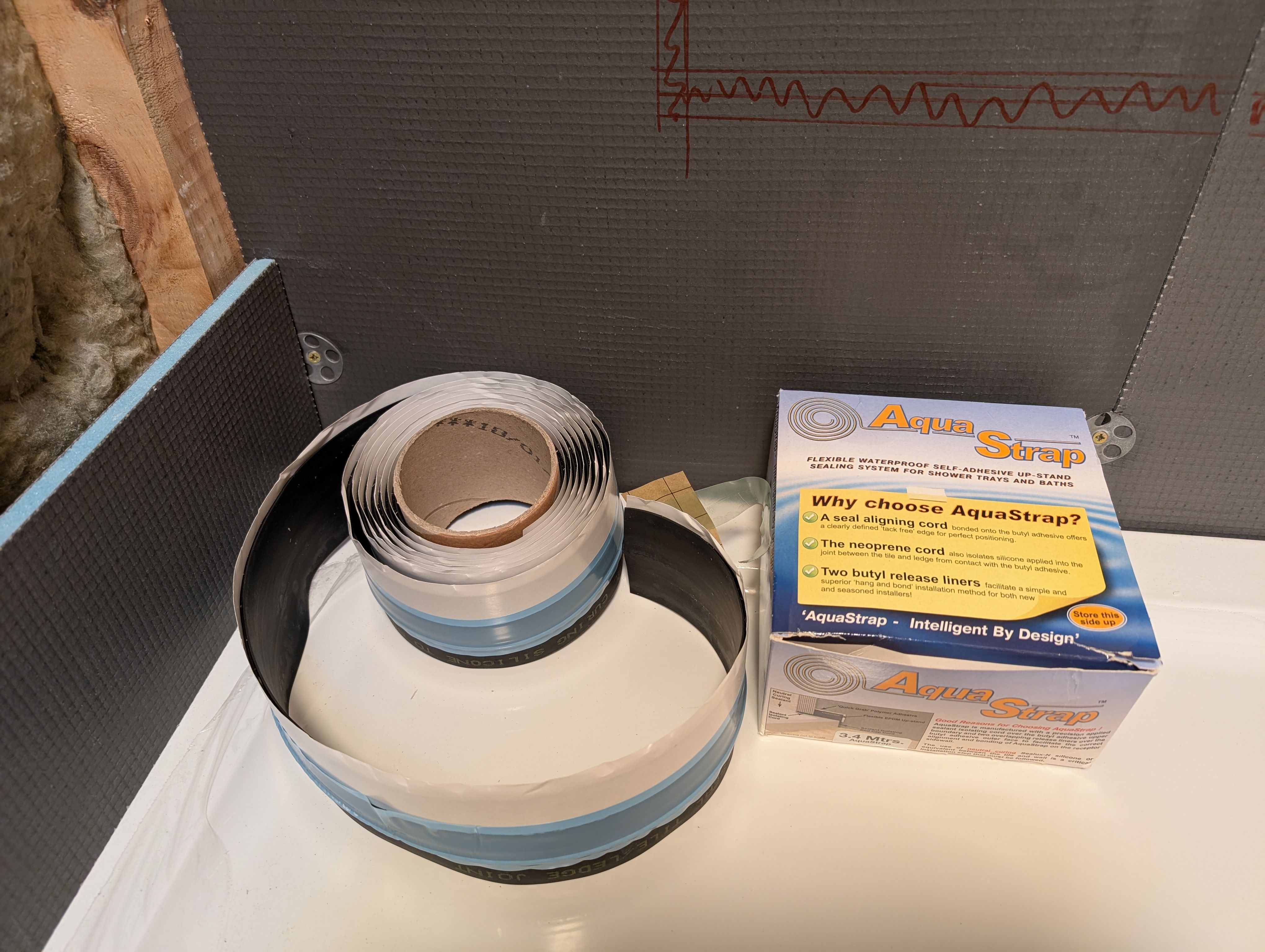 My challenge tonight is that at the shower tray is bigger than the room so at the ends the backer board overhangs the shower tray so getting the sealing strip to work is difficult.