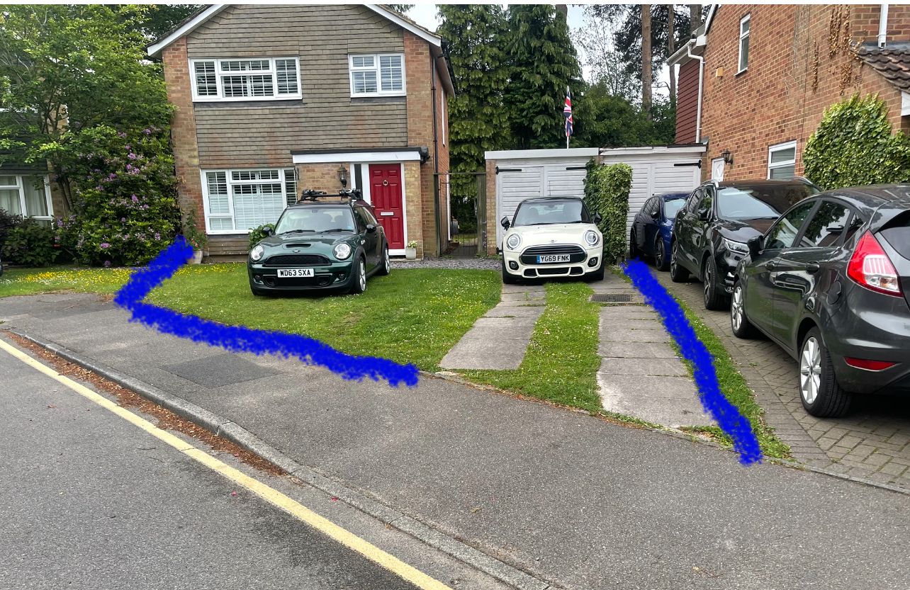 My query is, on both sides of the driveway I have my neighbours grass (to the left of image) and to the right, grass, perhaps slabs of stone - need to determine the exact boundary. Also the area adjacent to the path. All marked in blue.