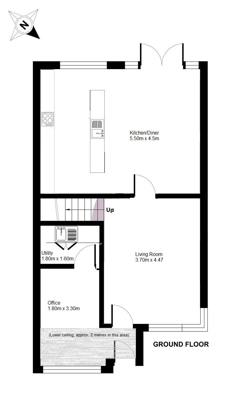 I'm assuming you don't have the height under the stairs to get to the utility that way (directly off the kitchen) as opposed to around the front and through the office?