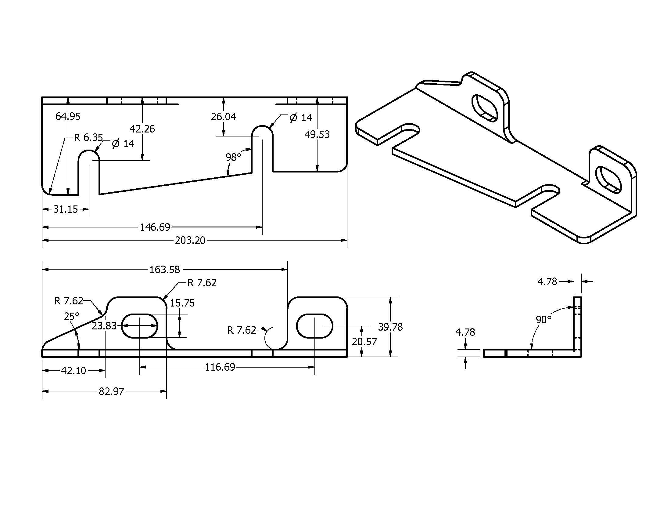 This is an imperial part drawn in inches. I can amend all the dims to metric (mm), as per attachment. Additionally, the plate thickness does not need to be exactly 4.77 mm nor does the outside corner radius need to be exactly 6.35 mm or 7.62 mm.You've dimensioned that to three decimal places but not specified a tolerance