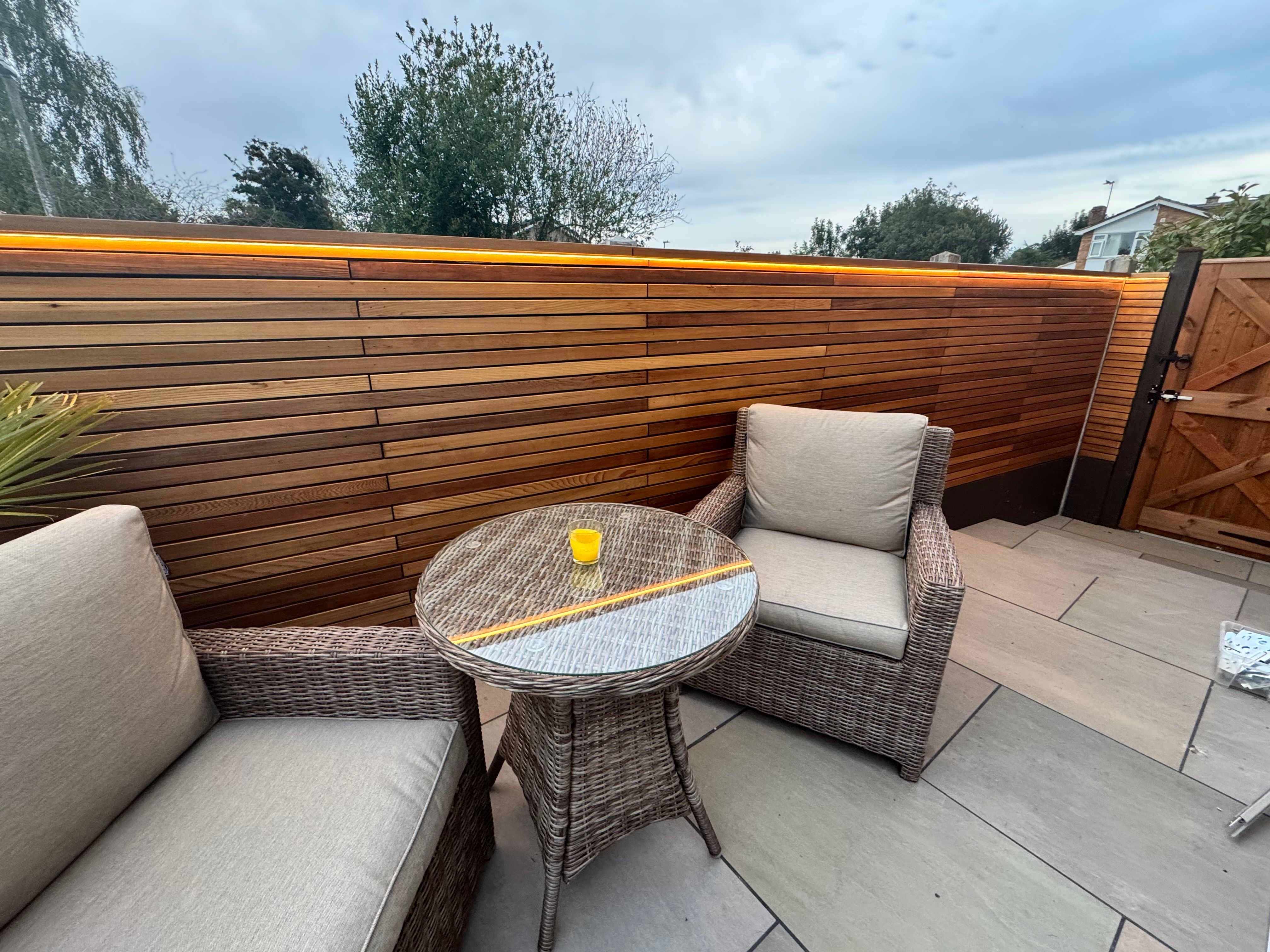 At the side of the house, we had an under-used area that ended up just getting stuff dumped there so made a feature wall. Because we'd be sat next to this, I went for cedar slats - much more costly but much better to look at up close. Also added a 'Love Island' LED strip: