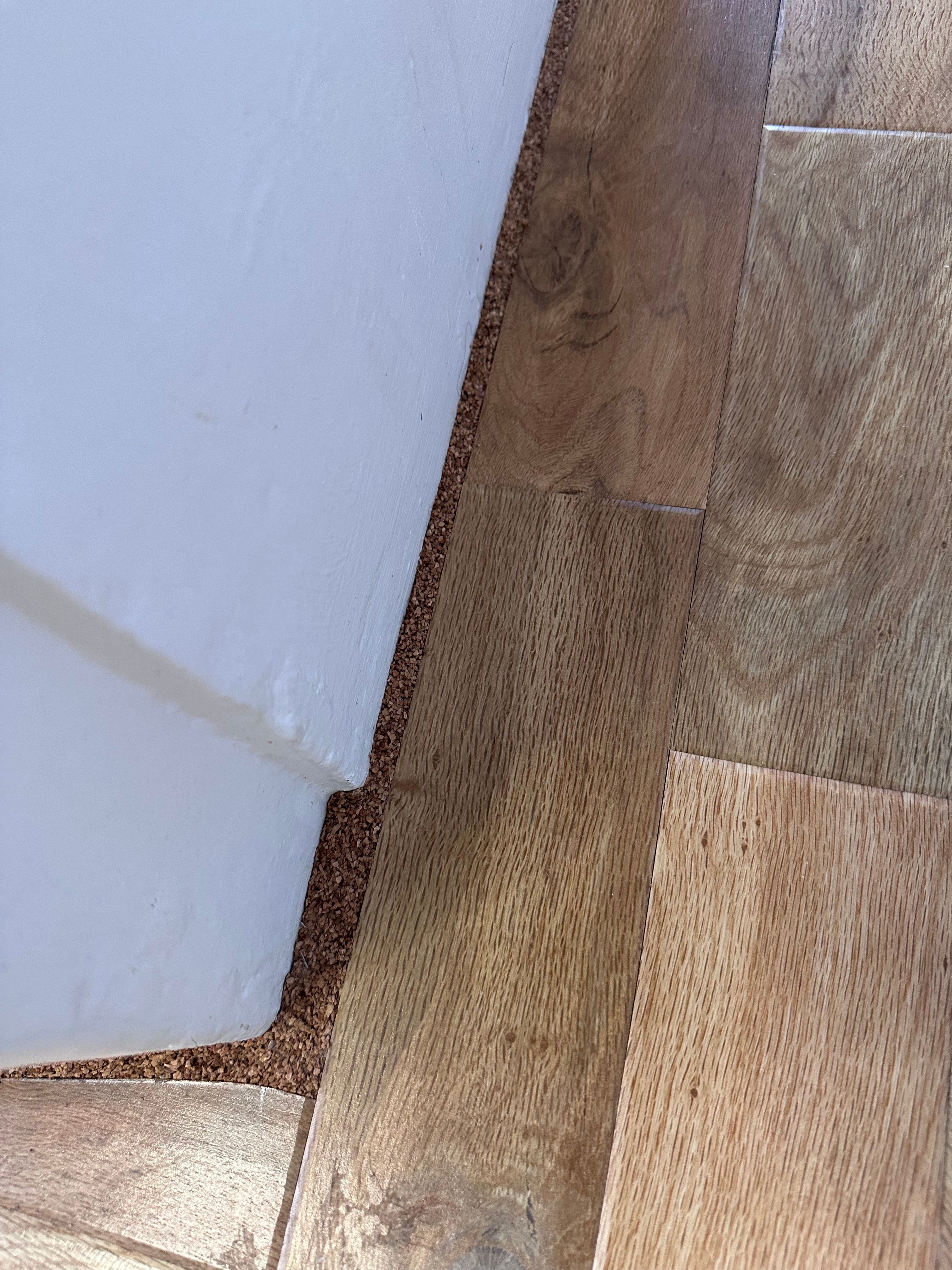 The house is over 200 years old so the rooms aren’t very square. Used Bona cork infill - comes in a sausage and applies like caulk.