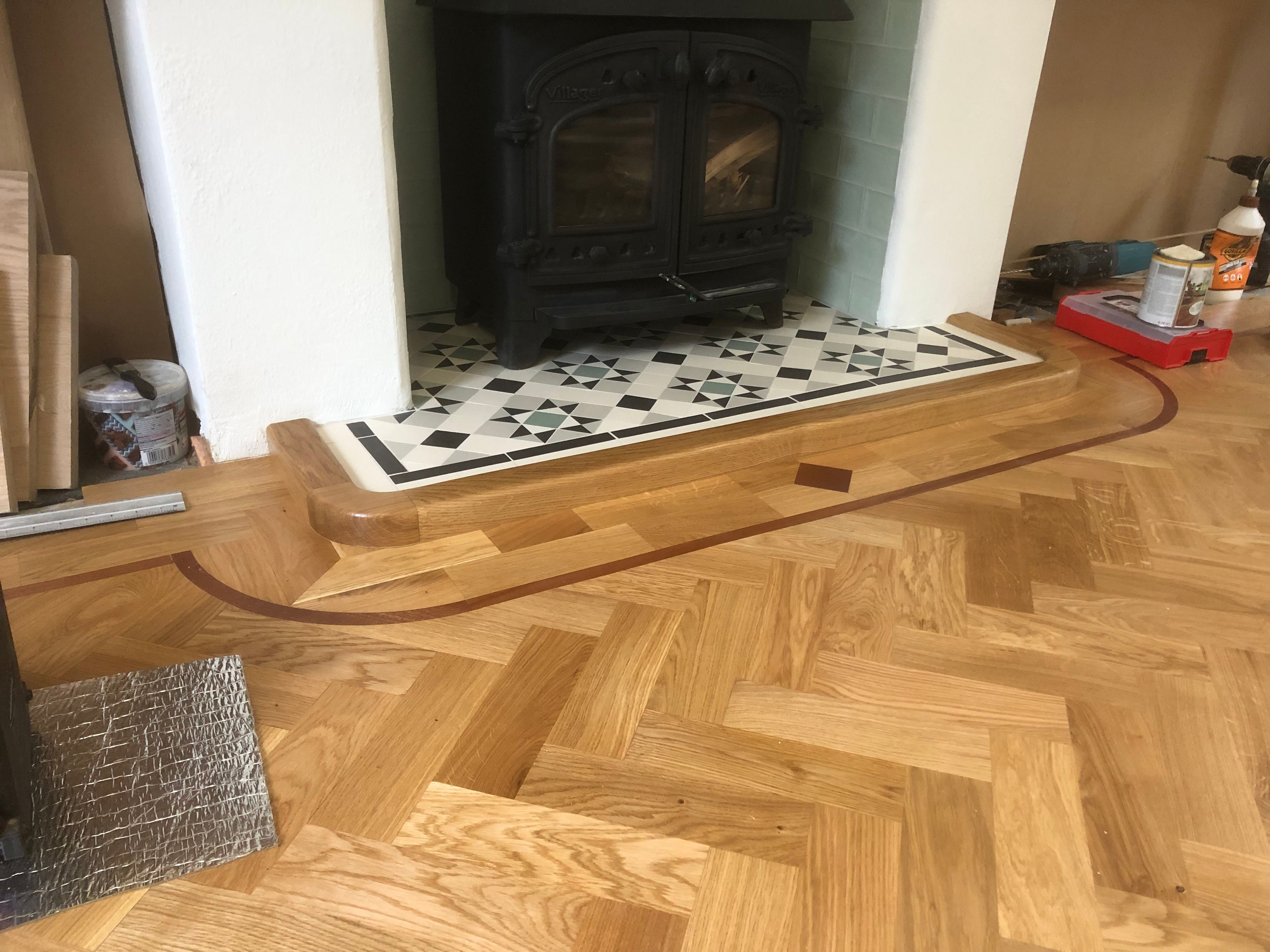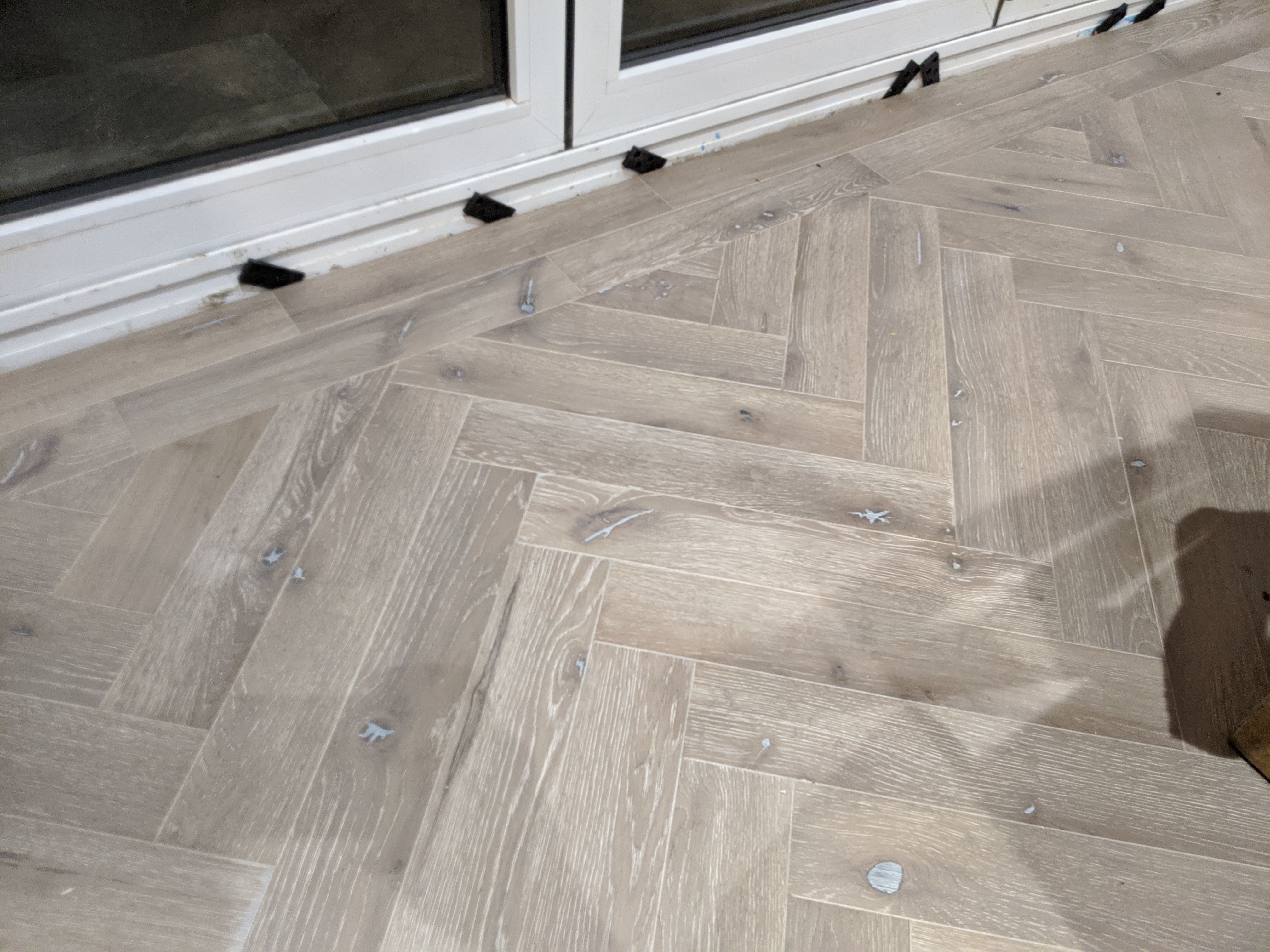 Glue down wood herringbone flooring.