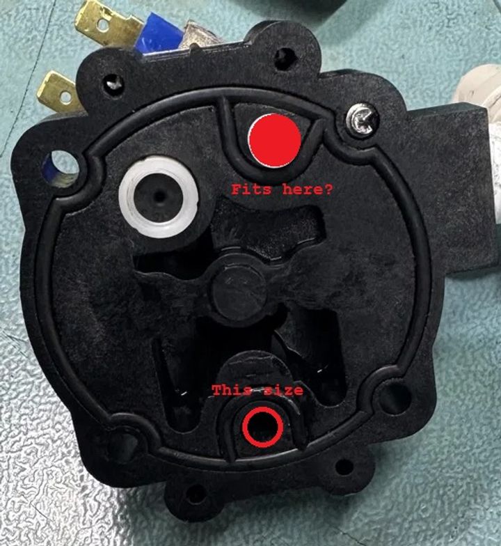 The ball seats against the white spigot on the right if this picIn terms of diameter - it was exactly the same as the lower hole in the above pic.
