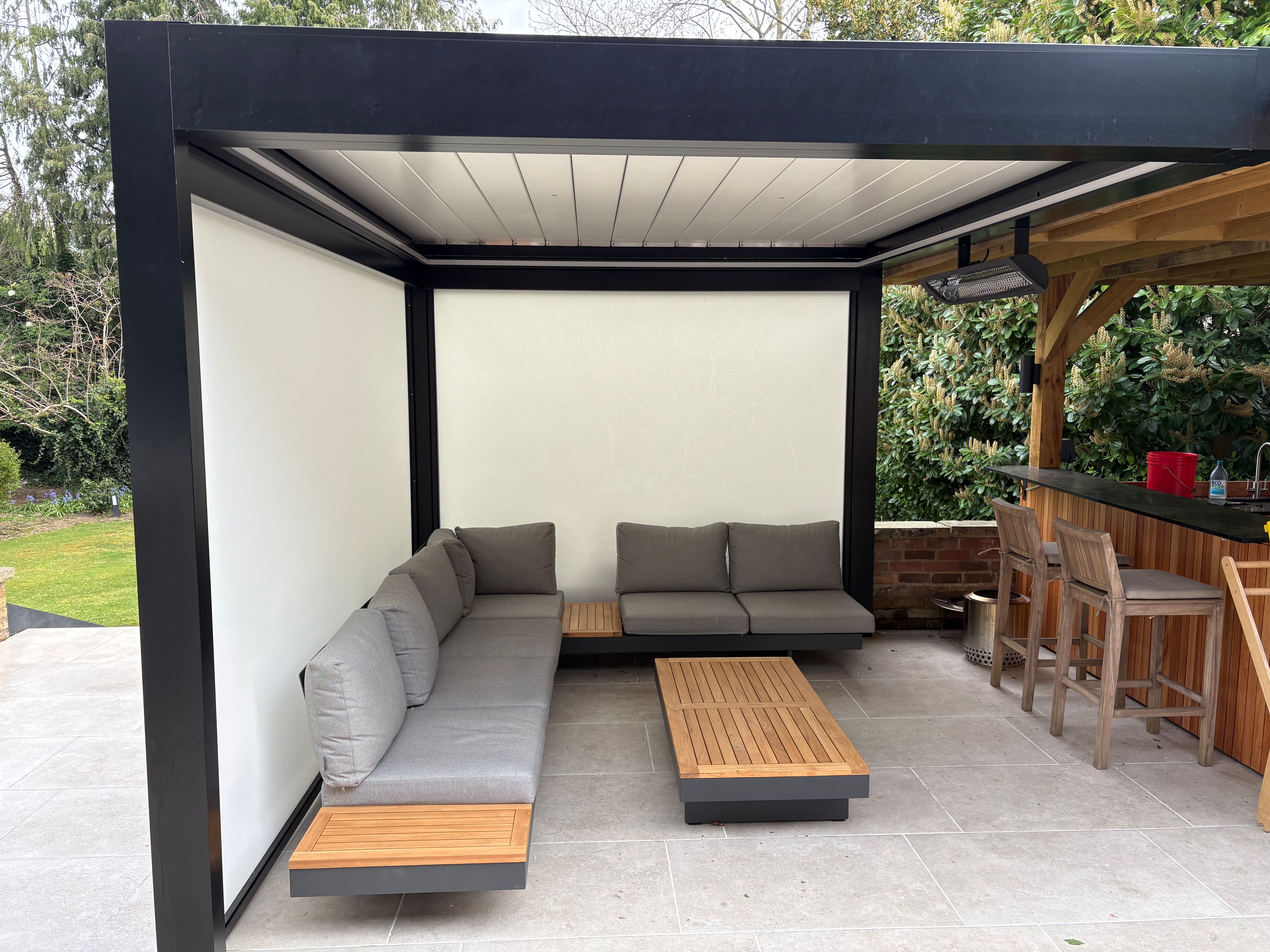 It's actually screwed into the metal frame of the pergola, but I can see how it looks like it's into the wood If it was mine I'd want a fireproof board of some sort behind it. Perhaps the sort of thing that's sold for installation behind consumer units or near log furnaces.