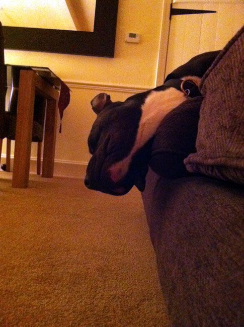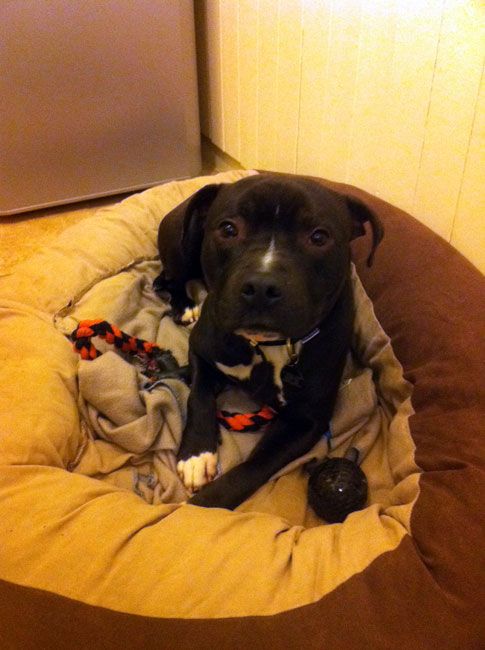 I've taken on a lovely young staffordshire terrier puppy from a dog shelter that was brought in as a stray. He was a bit bouncy and excited, but I've had him for 5 days, and he's settling in a treat.