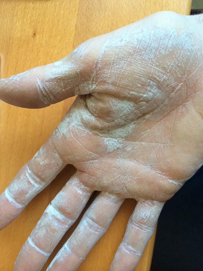 The acetone seems to be drying it completely out, and it seems to be rubbing/scraping off reasonably well, at least on the top of the hand.