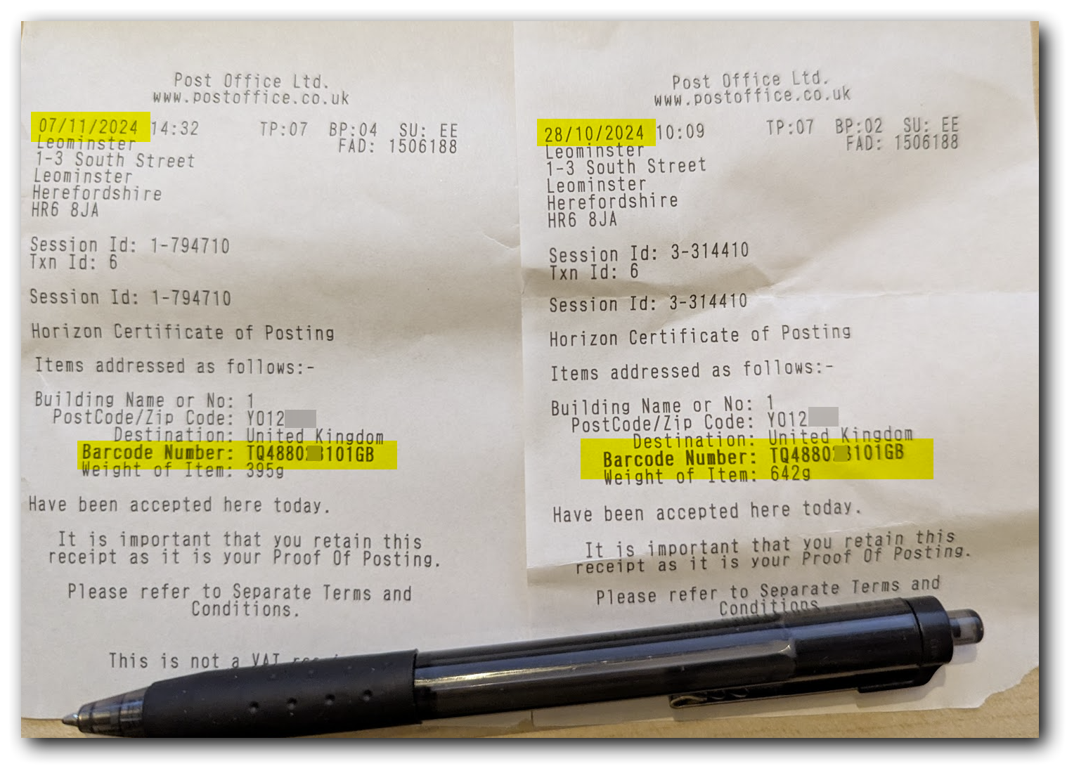 Posted a second parcel last week, intended for a different destination but accidentally got the previous QR code scanned at the post office. Address label is generated directly from the code and stuck on at the counter, so I didn't spot the incorrect delivery address.