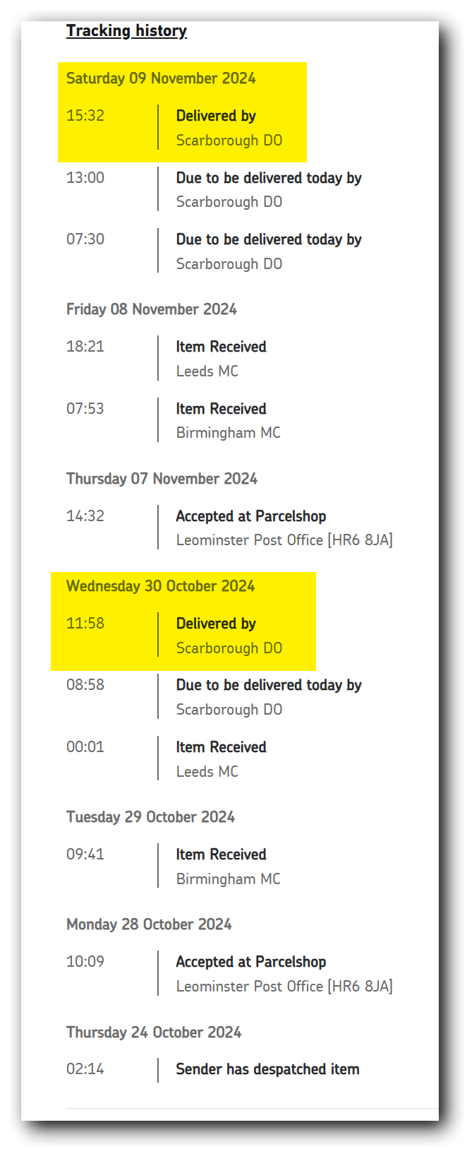 The second parcel was posted a week after the "Post By" date on the QR code...