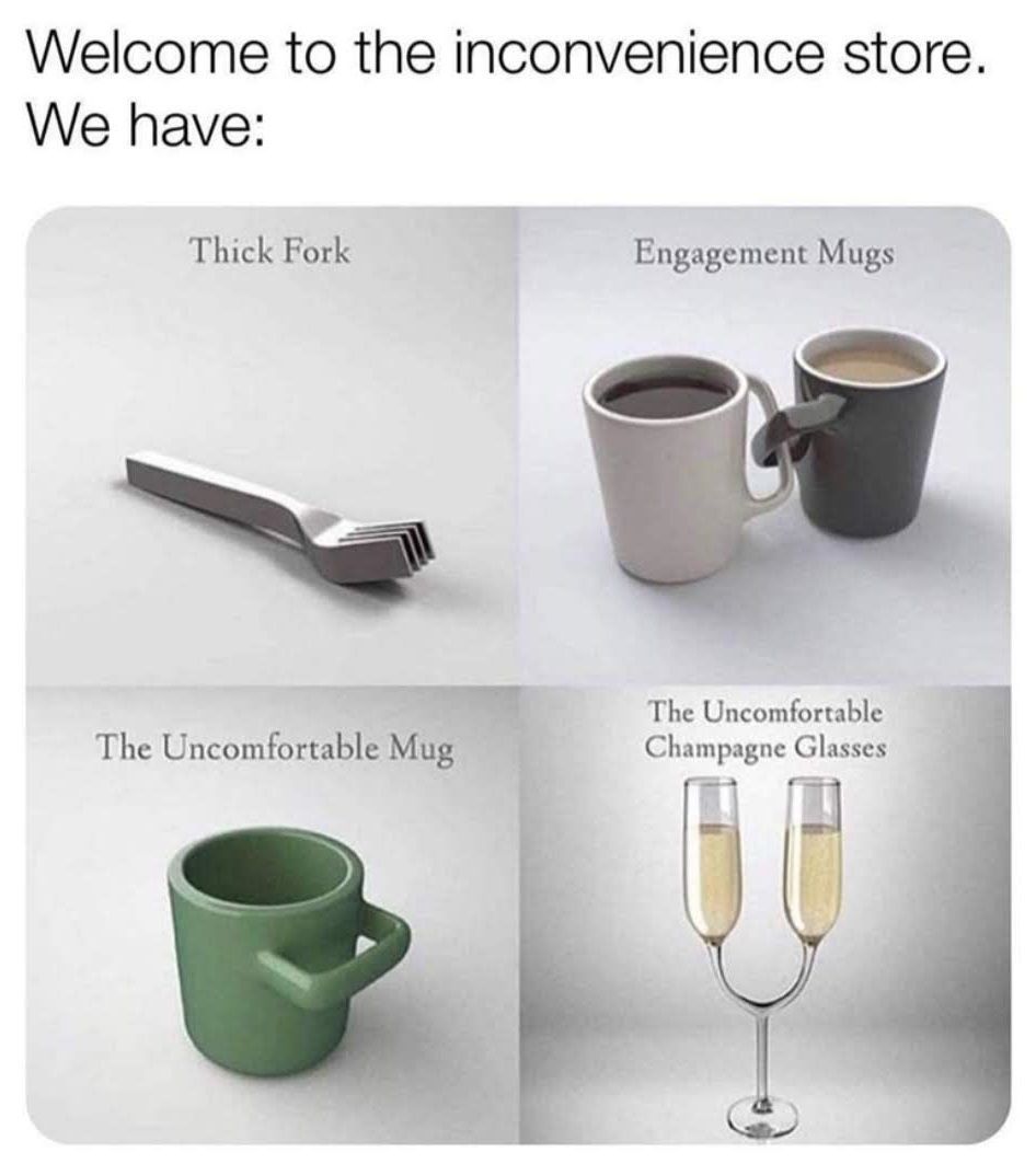 Other design failures that annoy: teapots that won’t pour tea without spilling tea everywhere, except the cup you are aiming for!