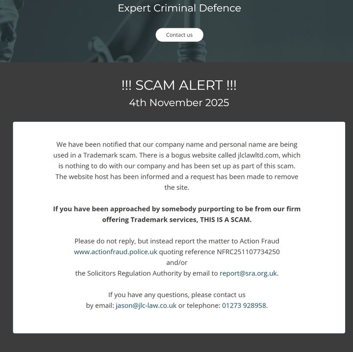 From the email, the scammers have gone to some effort (or copied a genuine one?) to set up a fake website: jlclawltd.com . Company reg no is 12345678