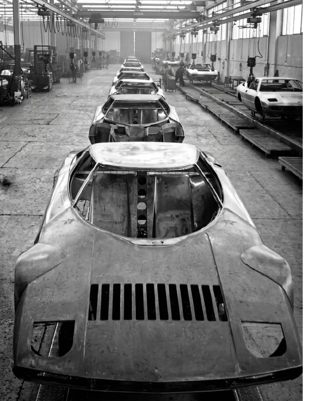This striking black-and-white photograph captures the assembly line of one of the most iconic supercars in history.
