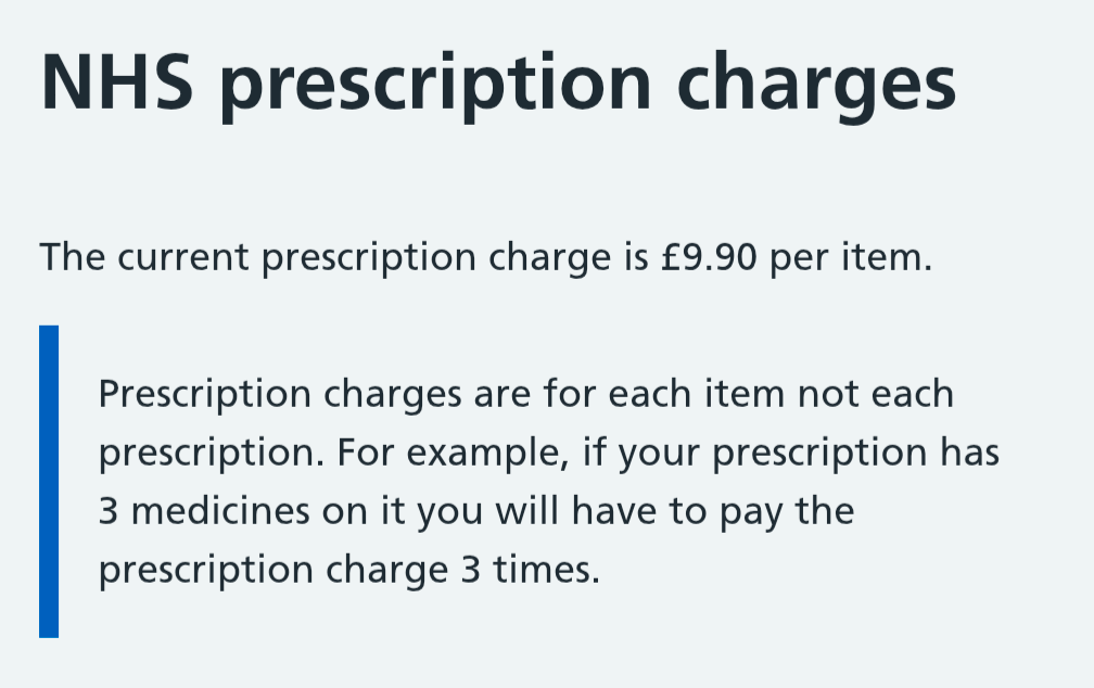 Just for clarity - It's only NHS England that works like this, in charging folks - if you were in Scotland, Wales or Northern Ireland - your prescription would be free* at point of need