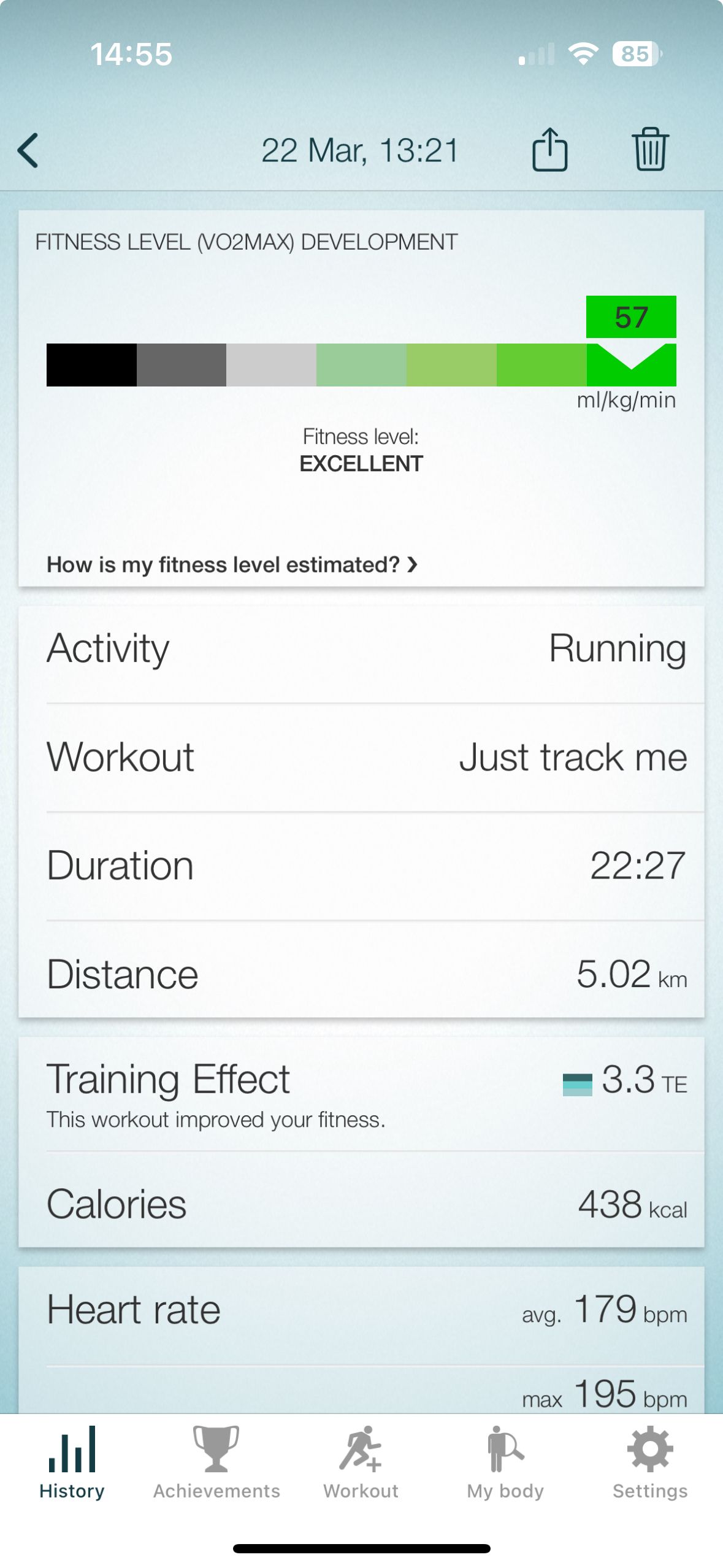 I've always used the Jabra headphone and app to track everything. Back then my fitness got up to 'Excellent' at 58ml/kg/min, as per below:
