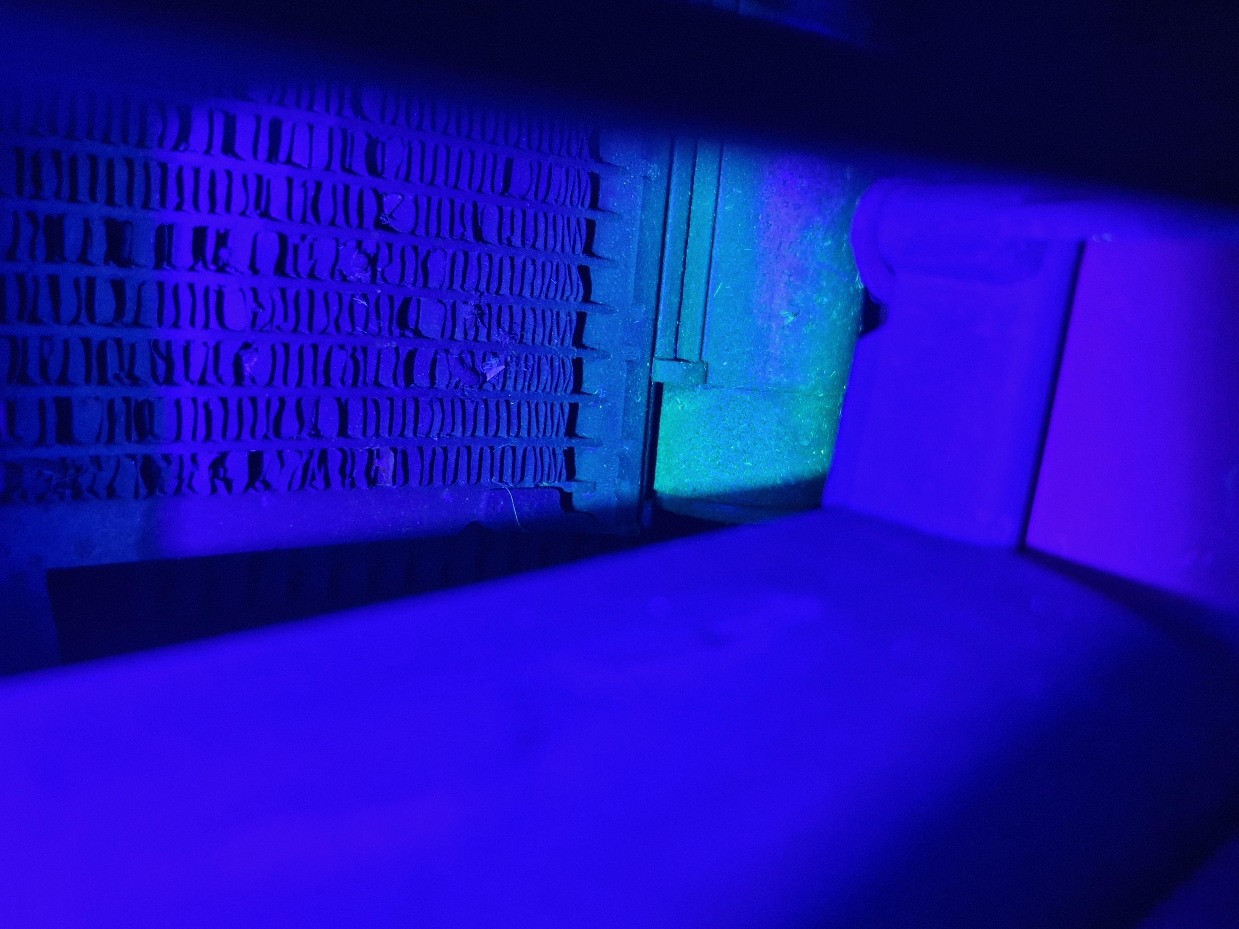 3. Now, this is the side of the condenser. I can see a definite haze of uv dye, but it's nowhere near as pronounced as the dye by the seal.