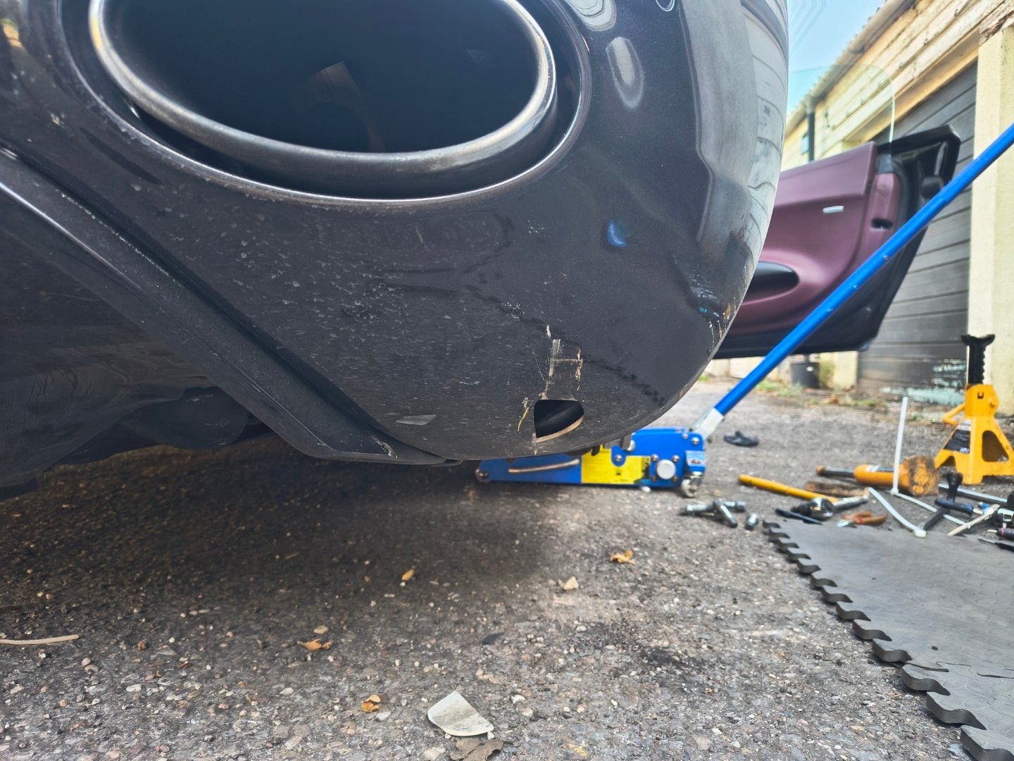 Axle stand through the rear bodywork and trolley jack sideways, crushed, with the side handle burried in the floor pan. £900 repair and repaint later, all done (though there is still the dent in the floor pan). Amazing professional repair.
