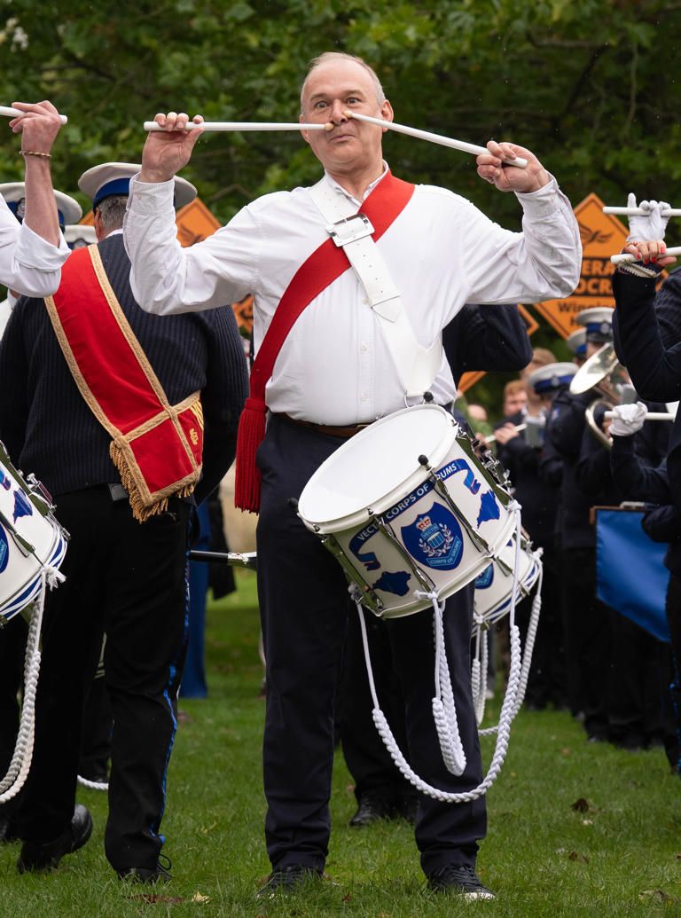 Approaching the conference hall twirling a baton with a marching band