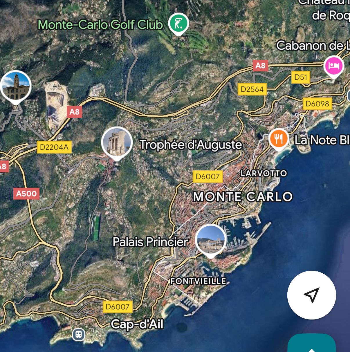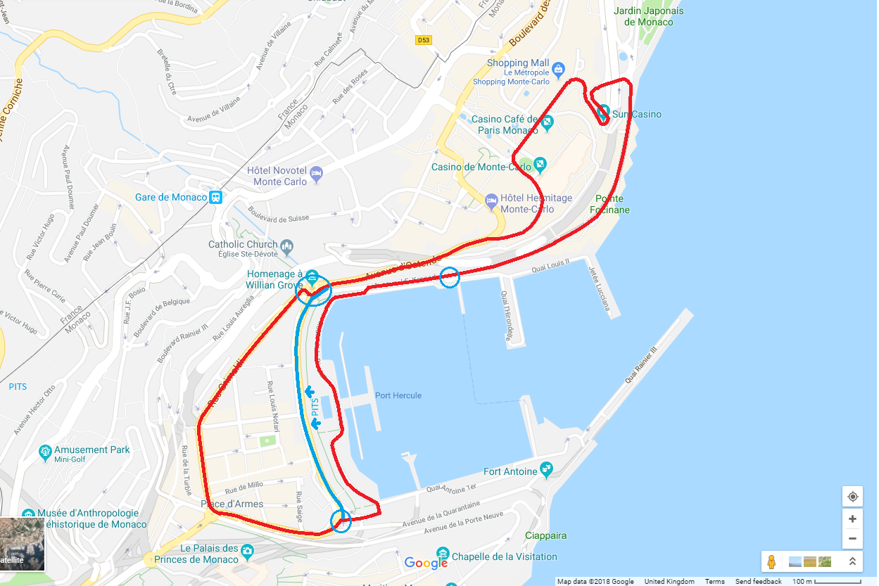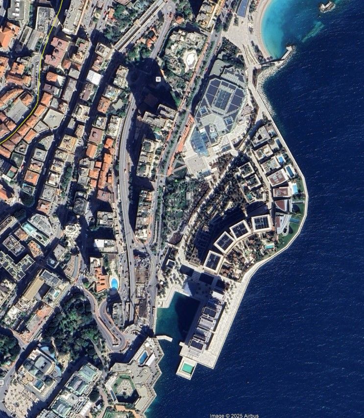 The Monaco circuit, grandstands and pits are still used but at the end of the marina straight they keep going, link up to the D6007, A500 and A8 with a new road built to link back onto the D6007 and rejoin the old circuit for the start of the next lap.