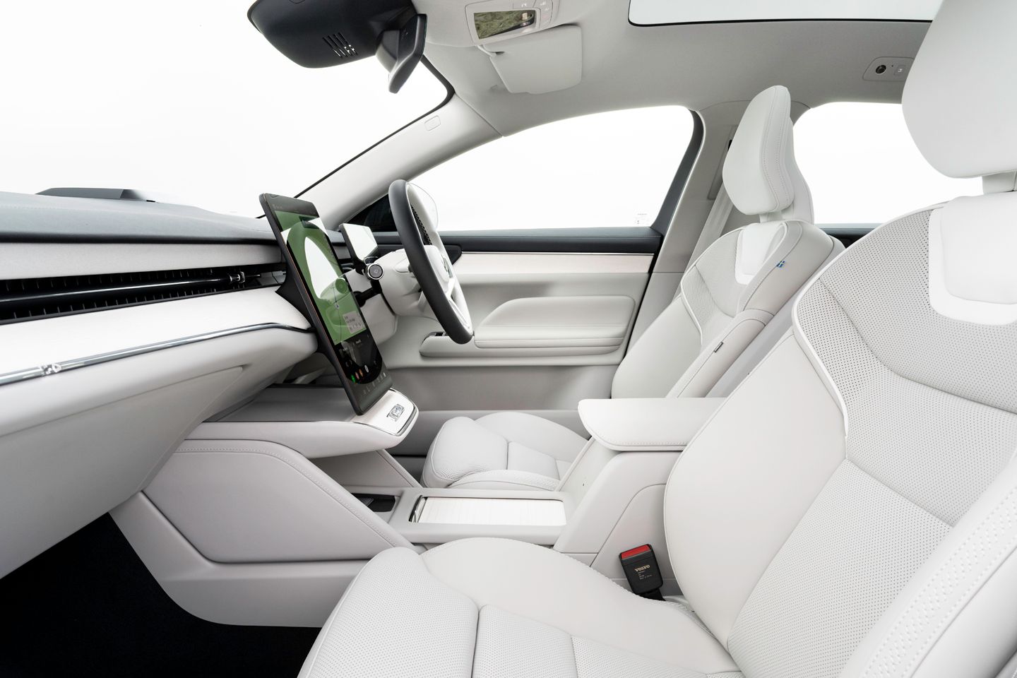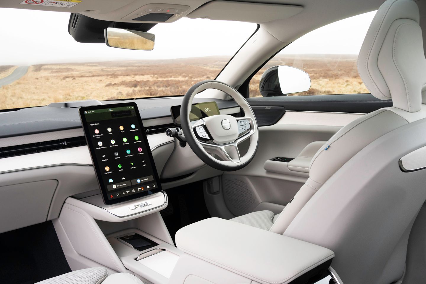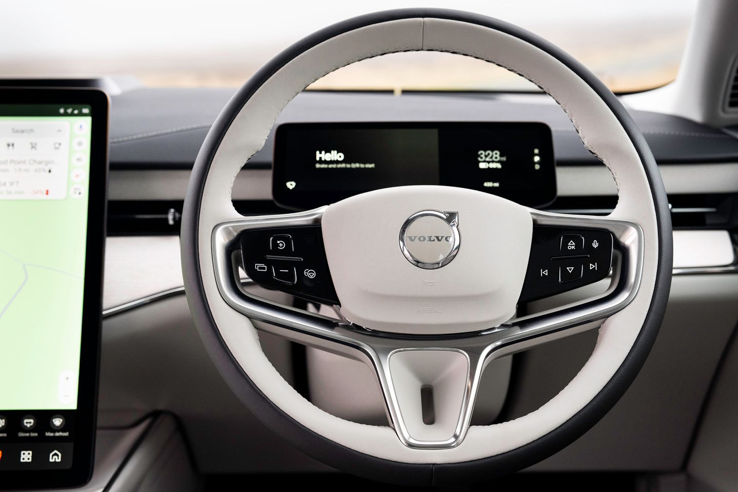 The ES90 interior mostly gets the Scandi chic thing spot on. There’s plenty of sunshine coming in through plenty of glass, which is complemented smartly by light leathers and woods. It feels plush and quite stylish without trying too hard. The seats, of course, are superb, and the steering wheel an unexpected delight, small and thin with the right amount of buttons. The sliver of a driver’s display behind it features all you’d need and nothing you don’t (the speed is on a HUD), in sharp resolution. Even the M6 on a Friday night wouldn’t seem too daunting sat here.