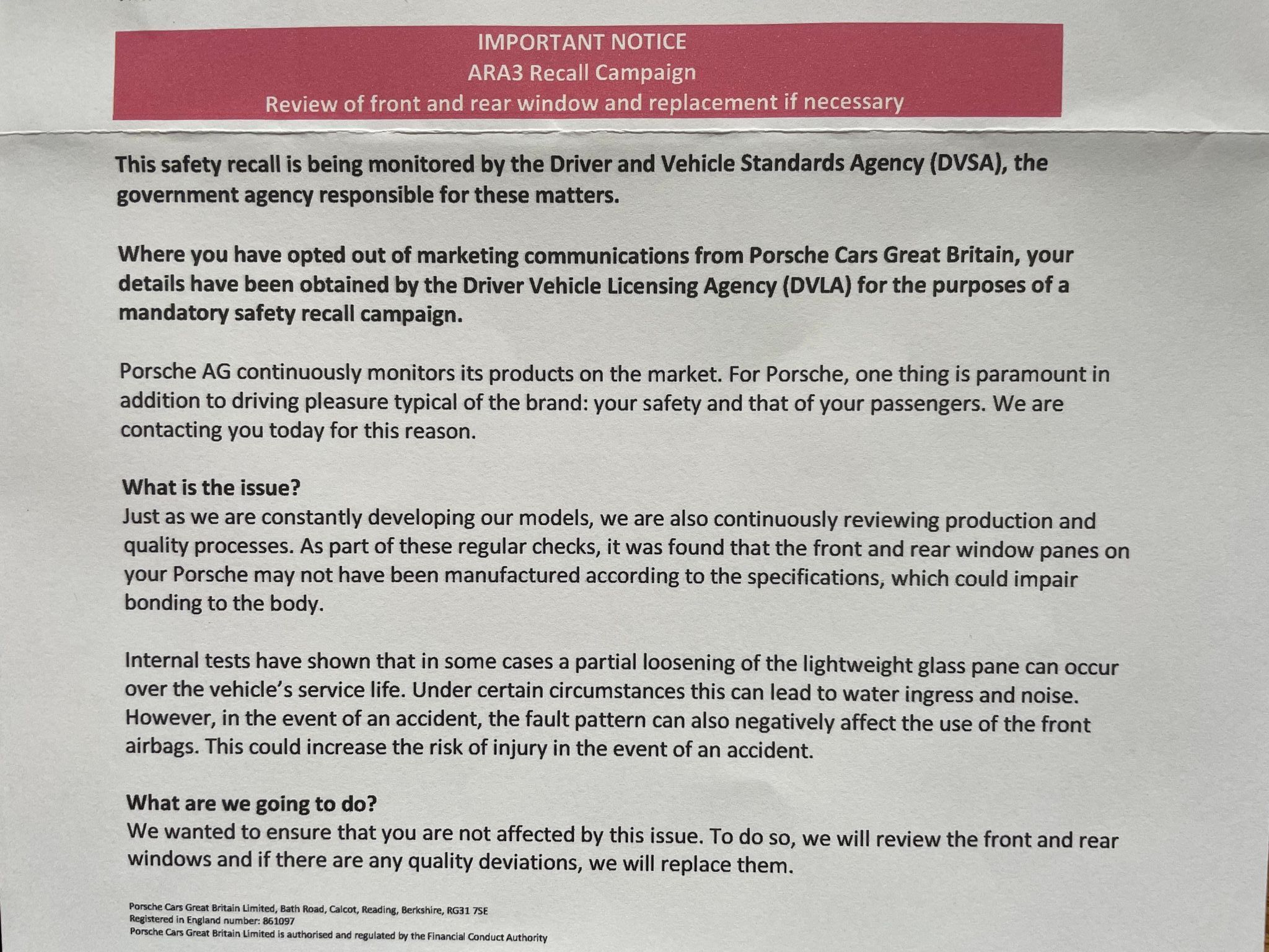 I had this letter drop on the door mat this morning, mine has the lightweight glass which I believe this issue relates to. Cars booked in next month.