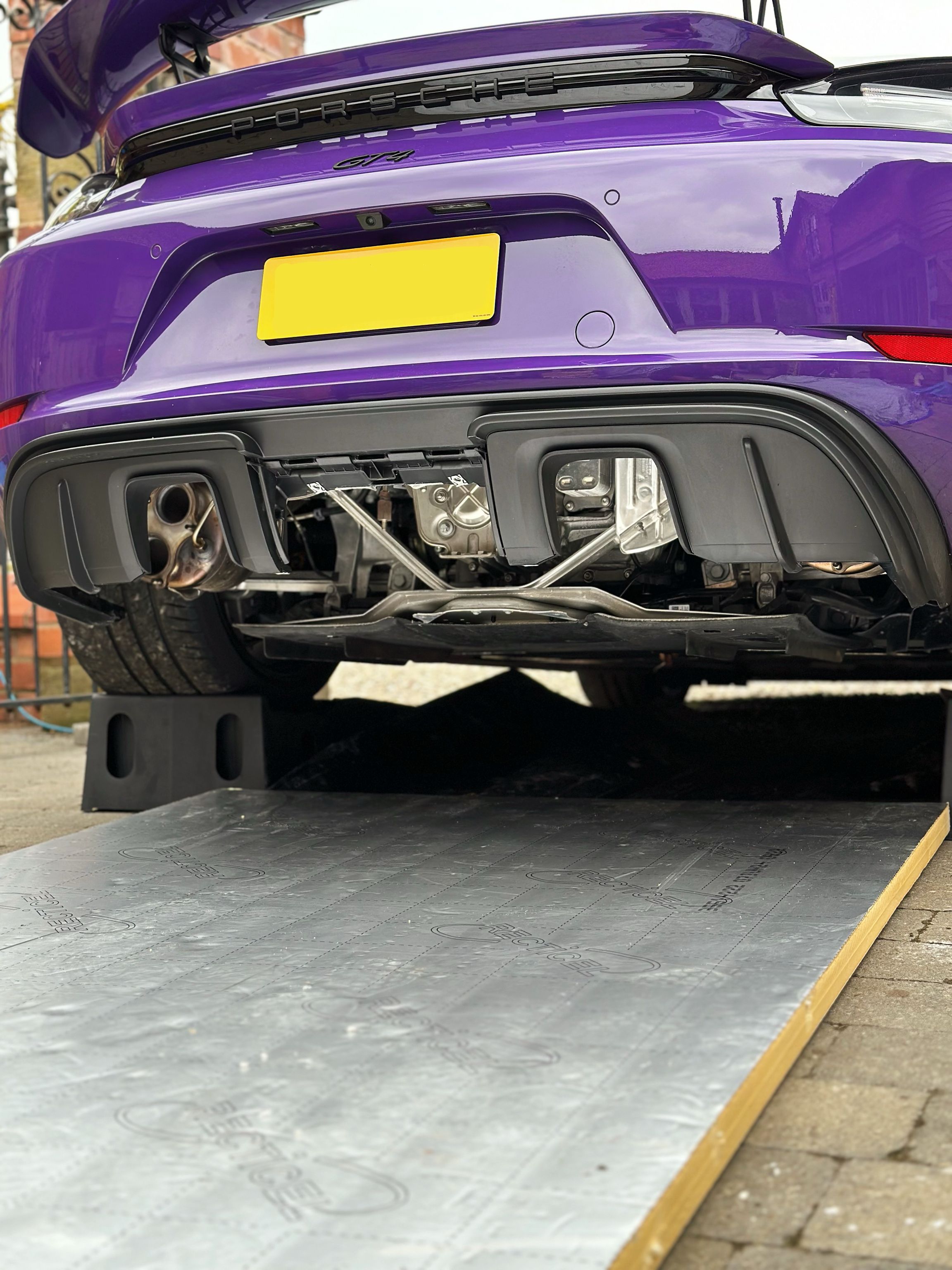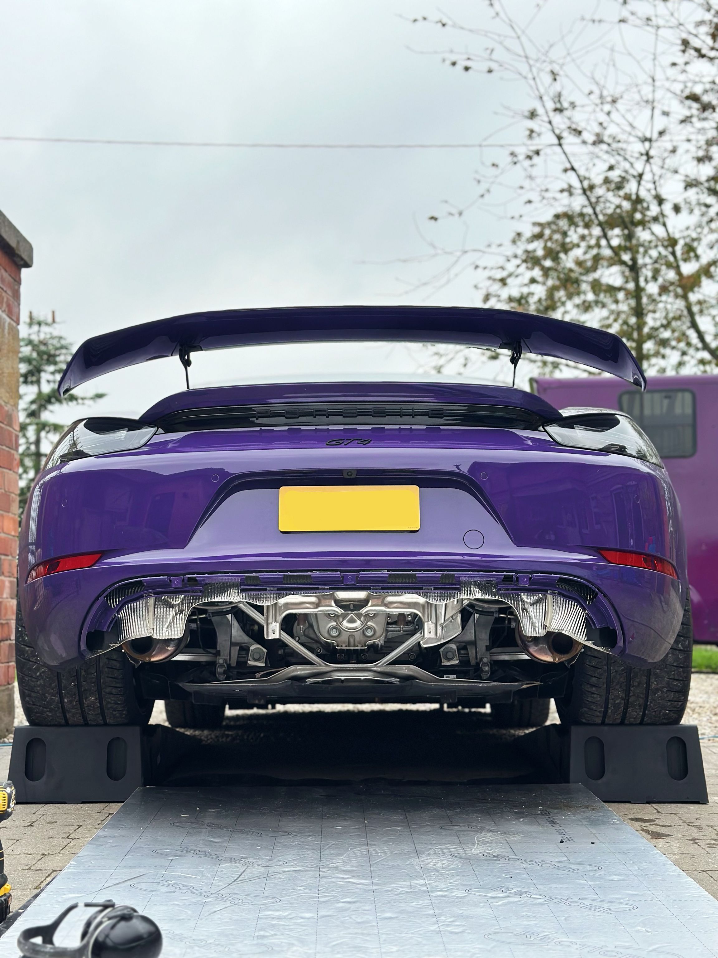 I couldn't bare that lovely looking Brooke Racing Exhausts Inconel 625 pipe sitting there, not doing anything. I had a spare hour, so decided to get to work on fitting it to the GT4. The garage is still out of order, so I decided to work 'old school', in the open air, within courtyard.