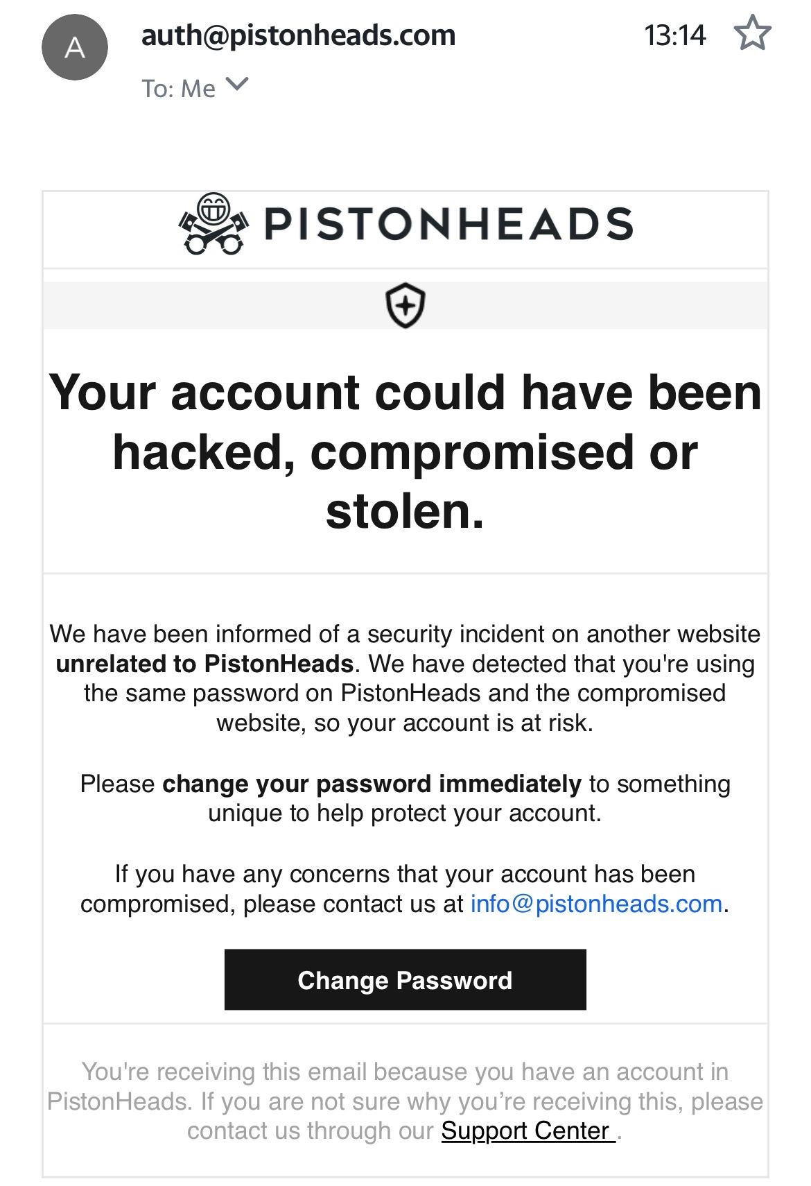 Bet if you go to https://haveibeenpwned.com/Passwords and pop your PistonHeads password in it'll feature somewhere else where you use the same password.