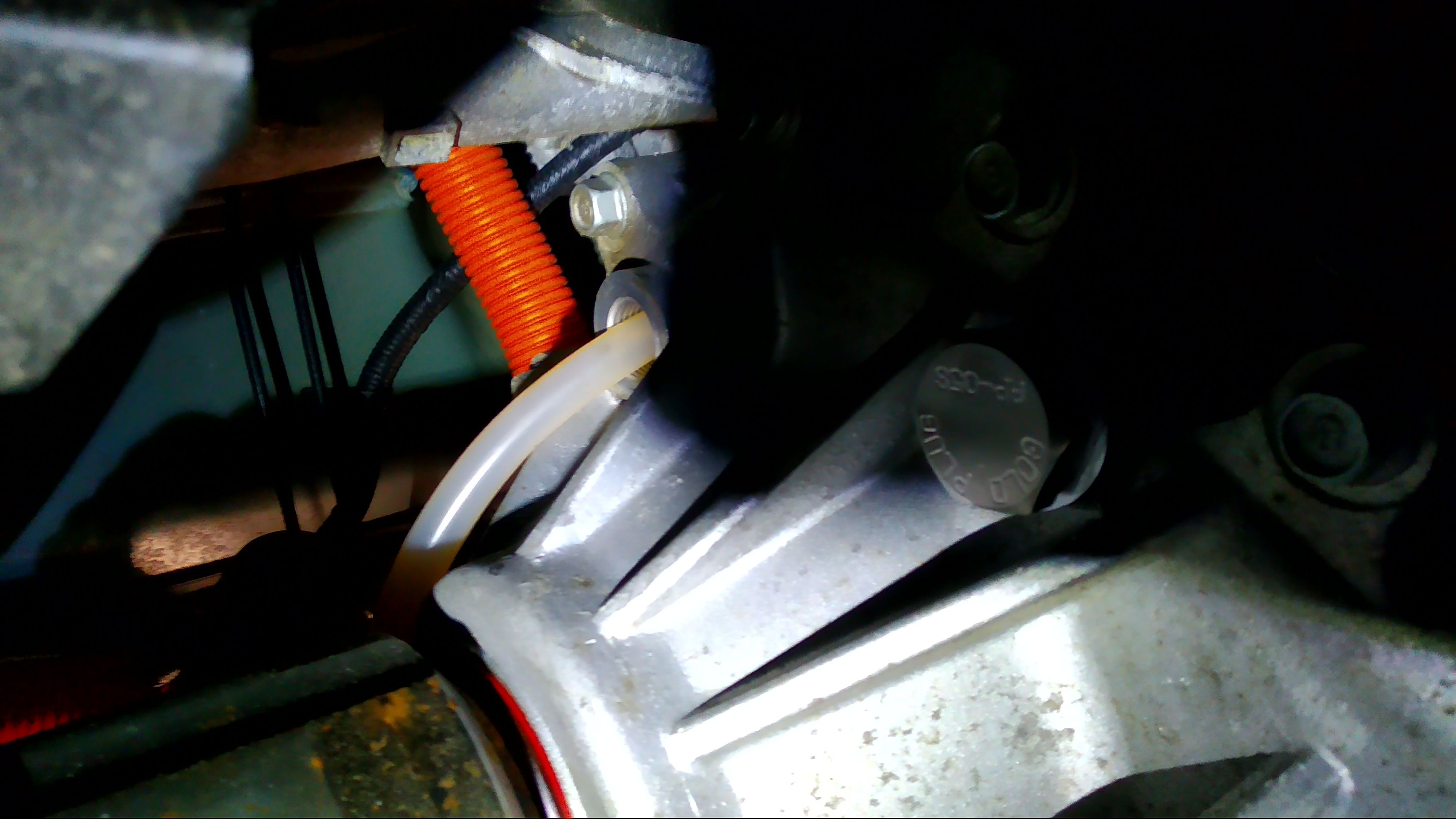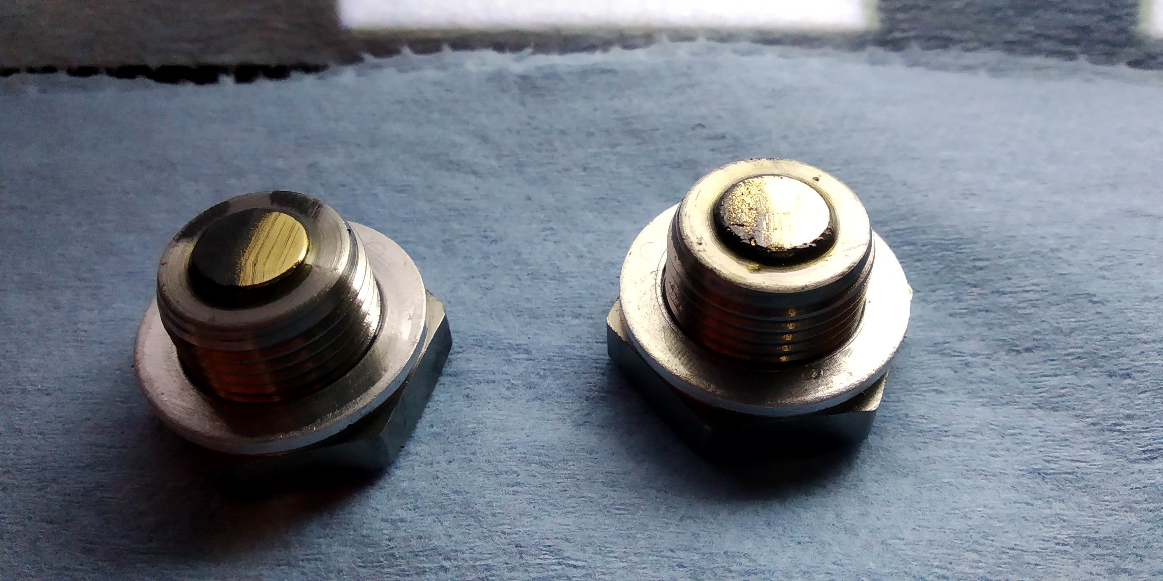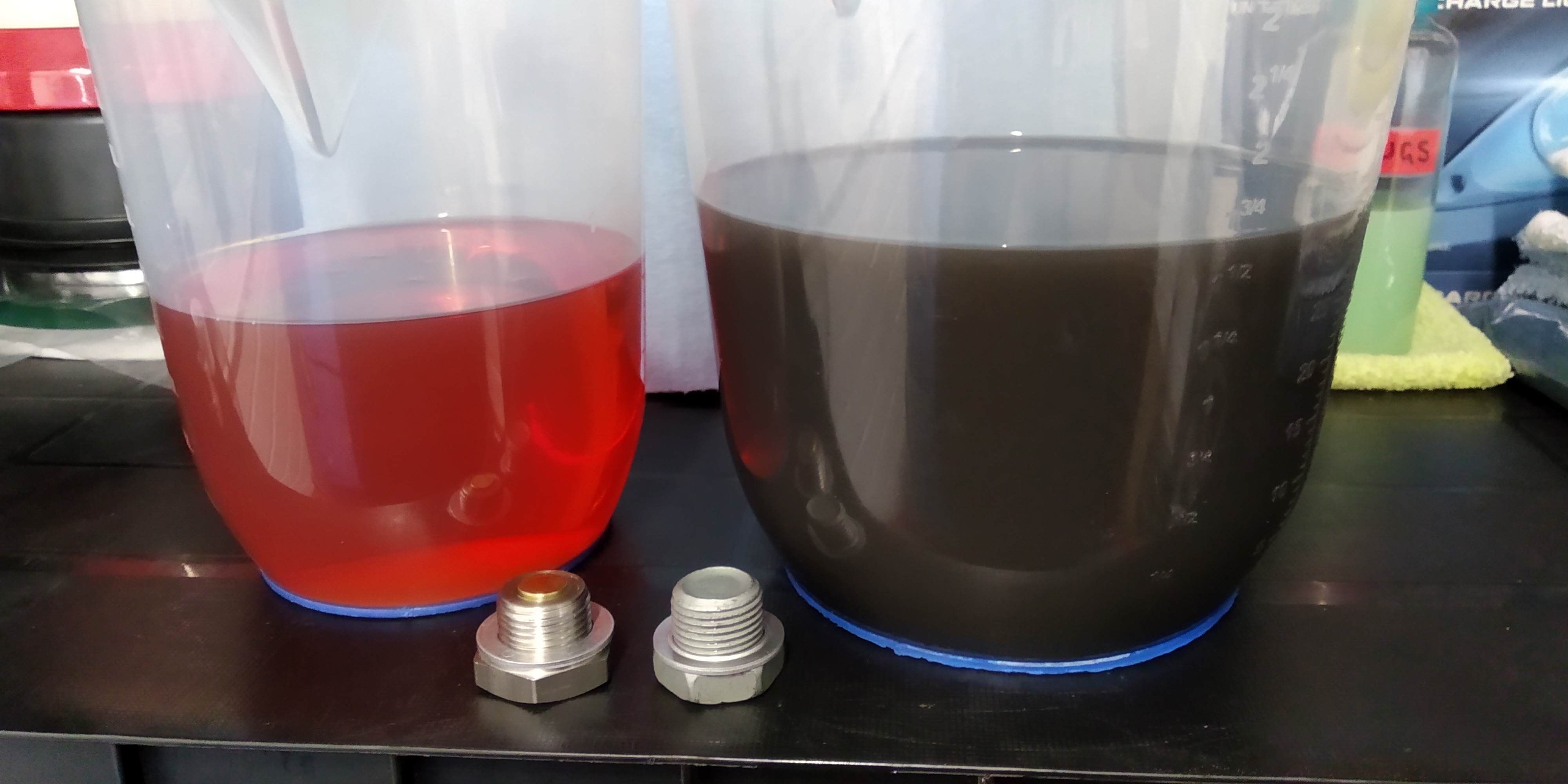 Fresh in comparison to used gear oil together with the replacement neodymium magnet, stainless steel drain and fill 'Gold' plug - I replaced both oem plugs. There is an internal magnet trapped within the assembled gearbox casings but obviously this cannot be cleaned of swarf at any point and is almost guaranteed to become overloaded in time just with normal wearing in debris.
