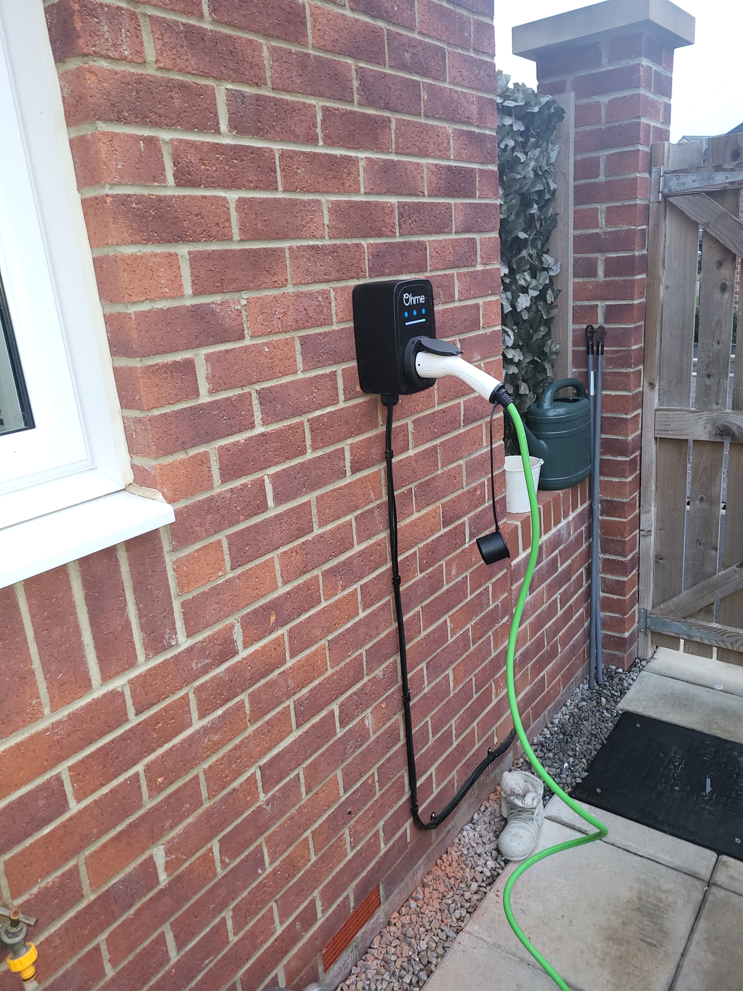 They ran the cables upthrough the bottom of the stairs to the landing upstairs, pulled up the floorboards, and wired through to the airing cupboard, then just inside that up into the loft. Across the loft under the boards, and down out the side of the house. In through the garage roof, and across the ceiling of the garage at the front, to the charger on the outside of the garage.