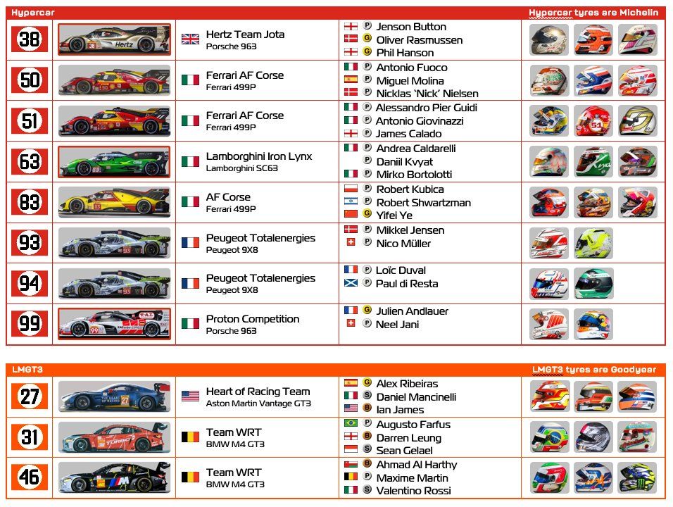 Hypercars constructed to the LMDh regulations (i.e. Alpine, BMW, Cadillac, Lamborghini and Porsche) have a red frame around the car picture.