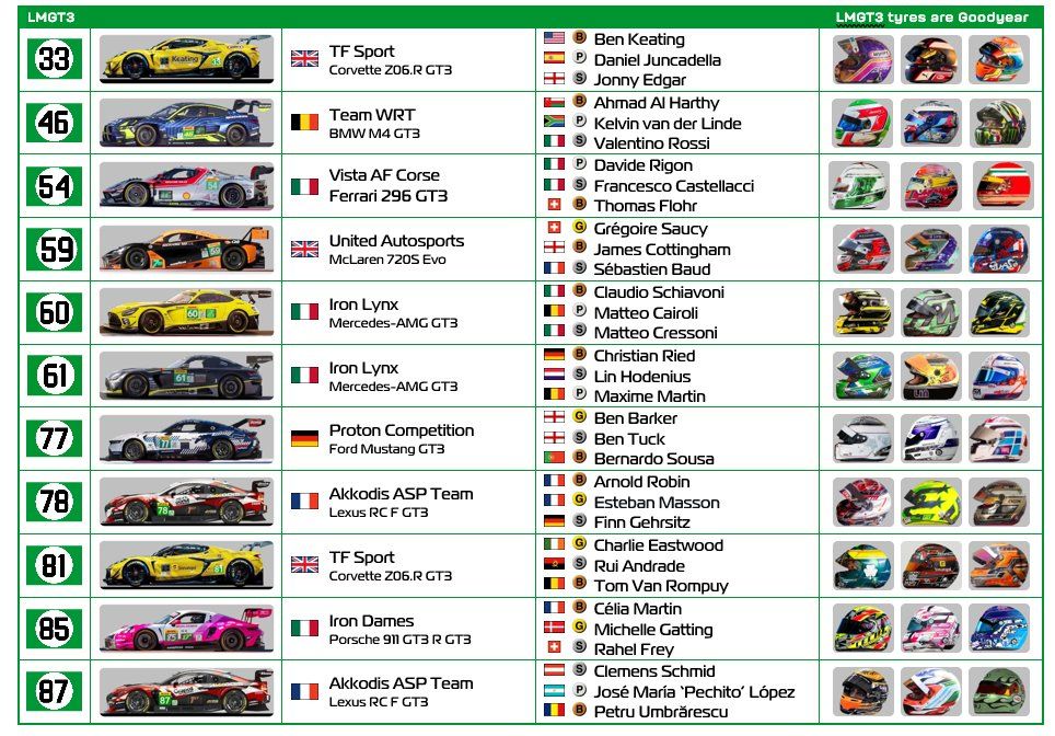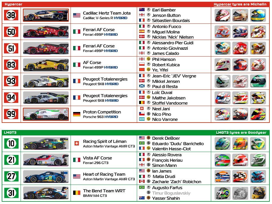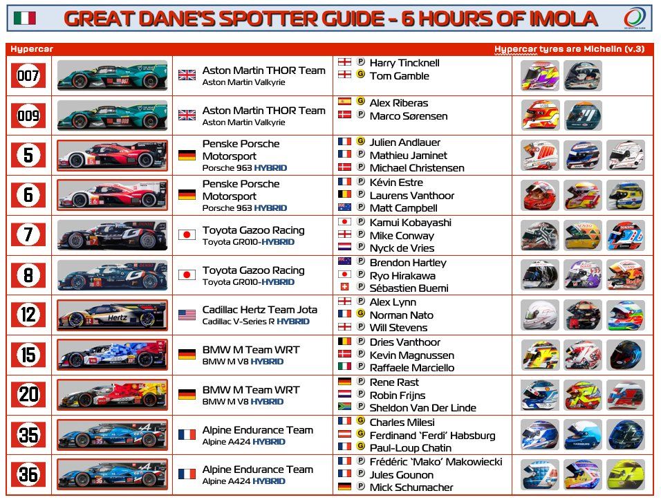 Hypercars built to the LMDh regulations (Alpine, BMW, Cadillac and Porsche) have a red frame around the car picture. We welcome the Aston Martin Valkyrie with its glorious sound to the first WEC race in Europe of 2025.