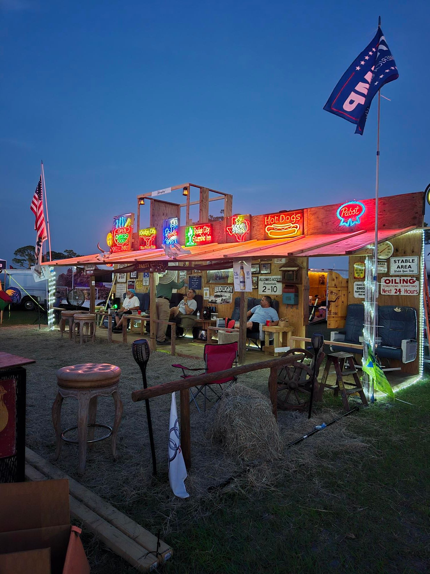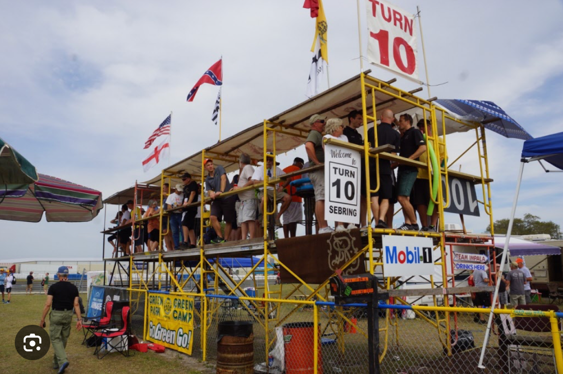 I have been a core-member of one of the more publicized camps at Sebring for the last 11 years. Turn 10 is a Sebring institution, as is F-Troop, McGruffs, Beer Town, Mud Sharks, Loony Tunes, The Magic Bus, La Bomba and Dodge City (pictured above). Turn 10 has 12 core personnel and around 350 affiliates who camp with and around us. It's the happiest, friendliest and welcoming camp at the event. We actively encourage people to visit with us, enjoy our hospitality and utilize our track-side viewing accommodations.
