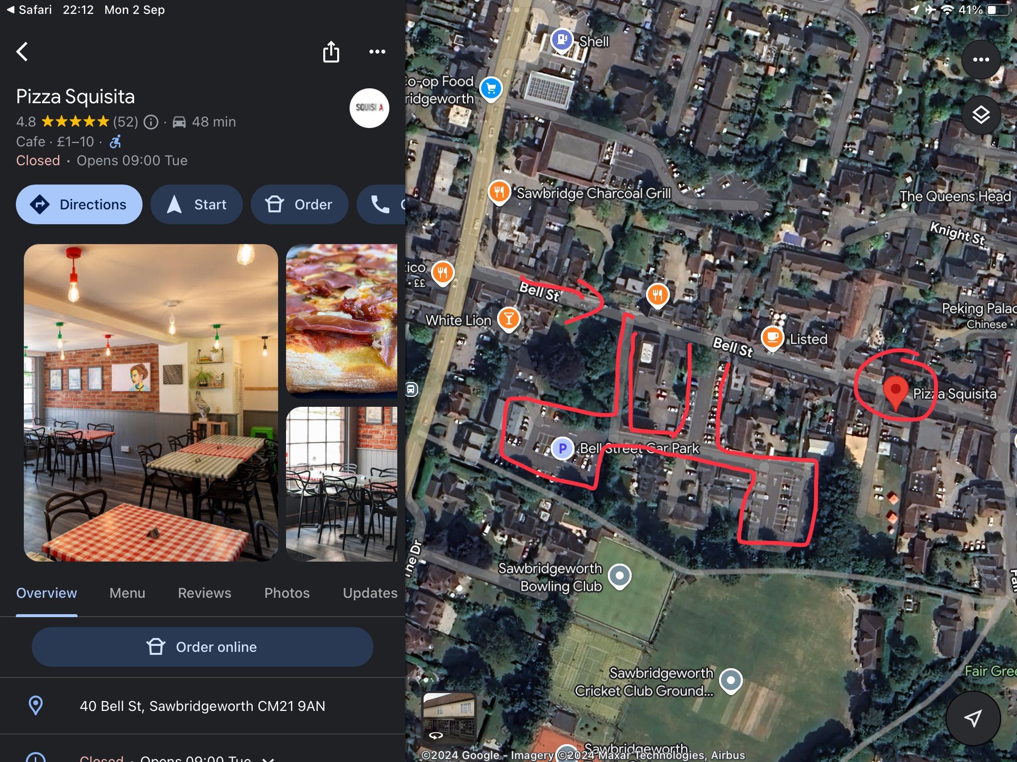 We park in Bell Street car park and walk ‘round to Pizza Squisita: