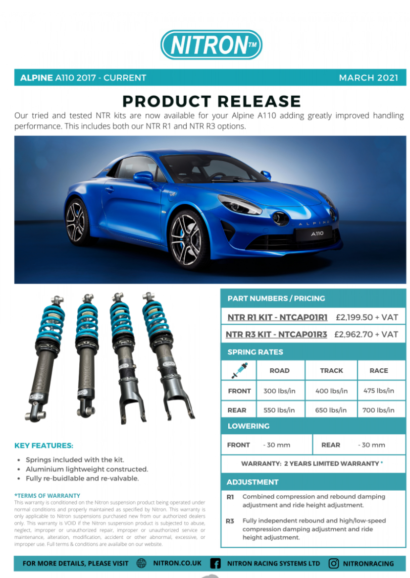 ...we are Nitron dealers and that’s what’s on my A110, again they are excellent, much better control with no loss of ride quality.