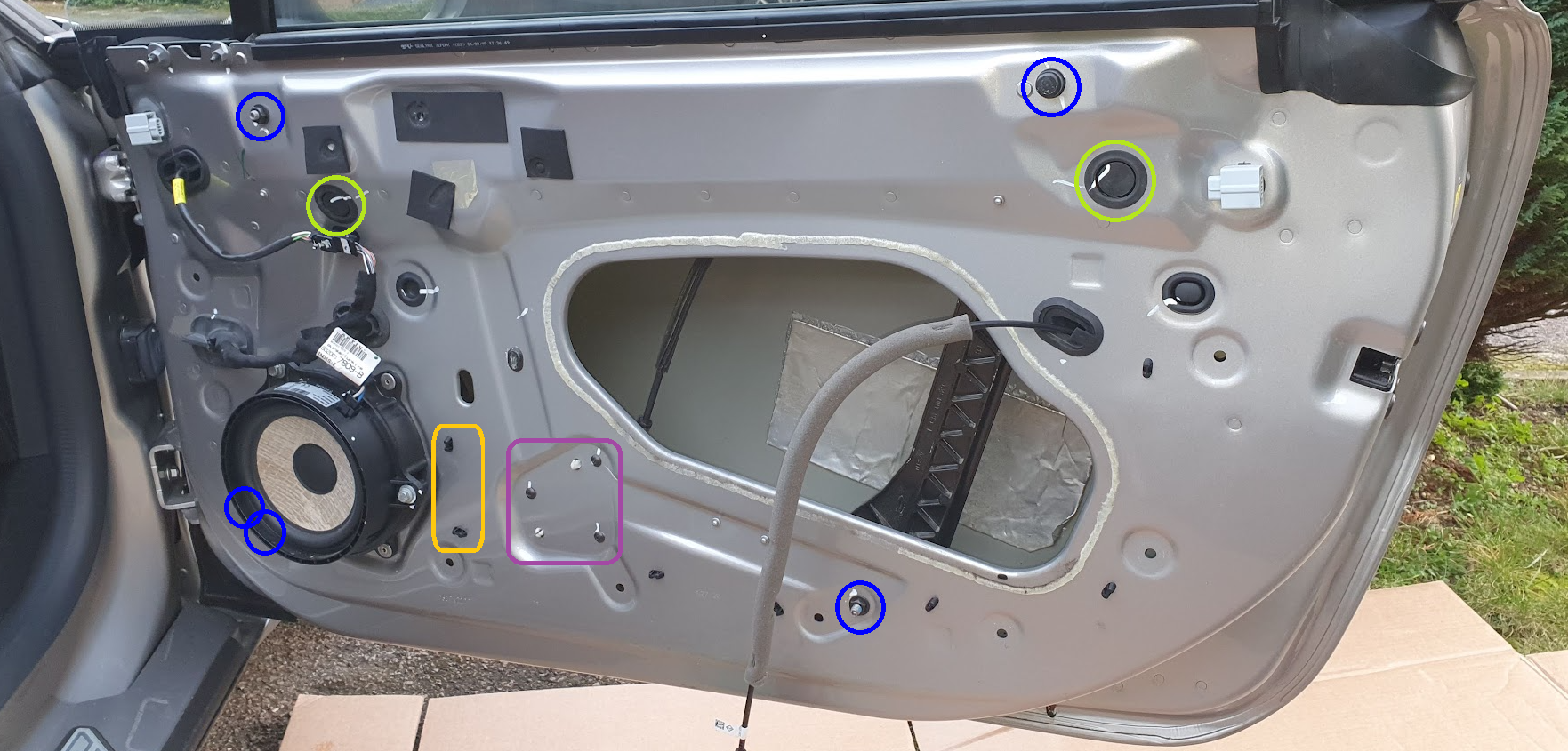 1. The lower-left screw behind the dust cover (blue, above): Make sure that the frame is correctly placed re. the fastener, I am not sure how, but I managed to initially position the regulator frame incorrectly within the door: The screw should go through the hole in the door panel (exposed by the removal of the dust cover), through the regulator frame and then into the threaded portion in the door.