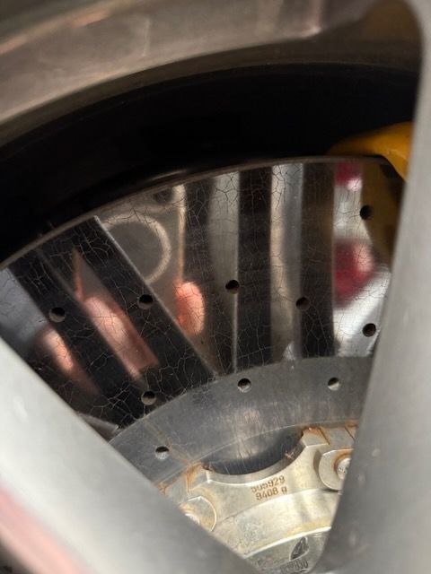 Some pics of the brakes... Im not an expert on the ceramic stuff but the discs look untouched and there is meat on the pads, more so on the rear.
