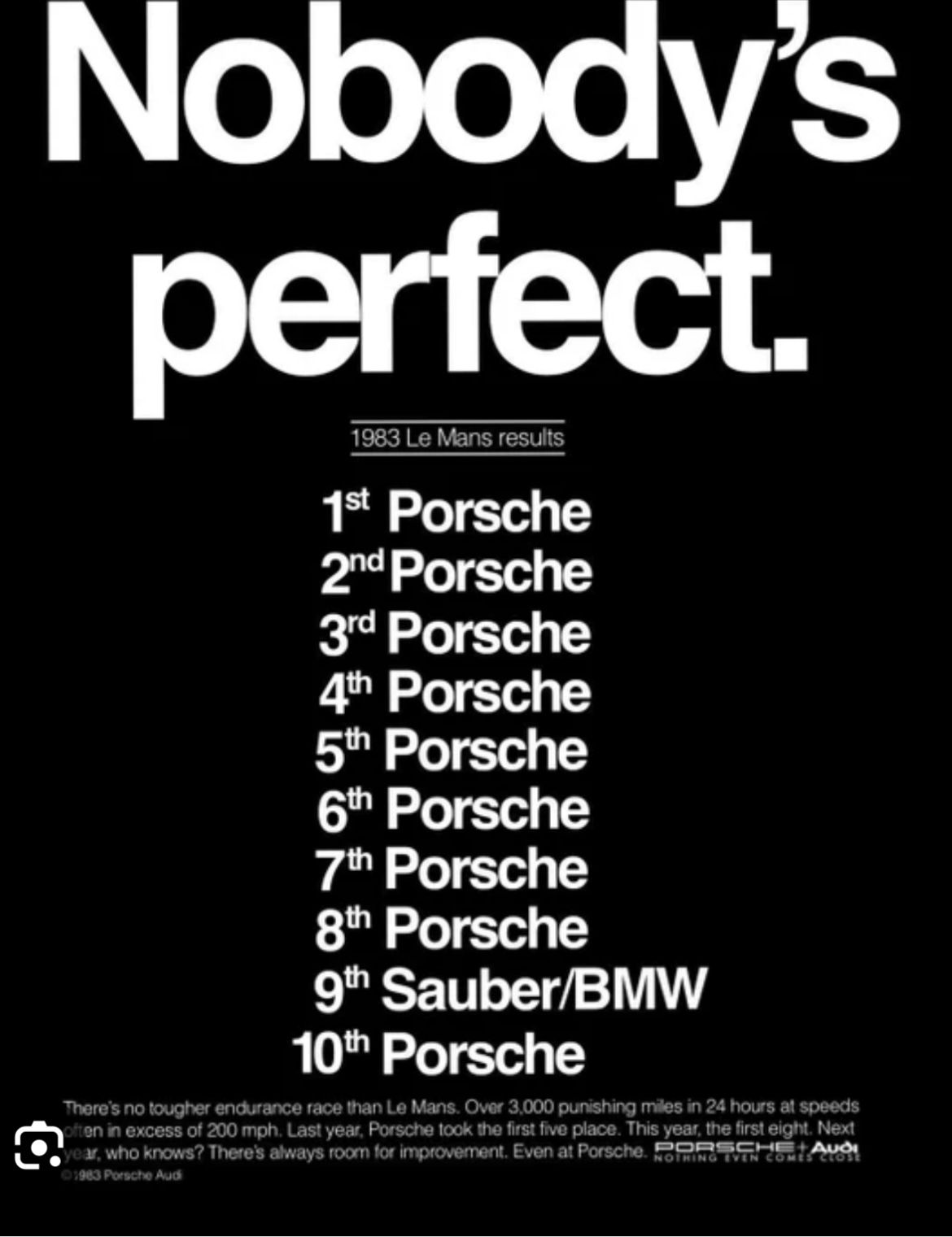 Even in periods of relative domination Porsche have acknowledged their weaknesses. The famous post Le Mans 1983 Porsche advert :
