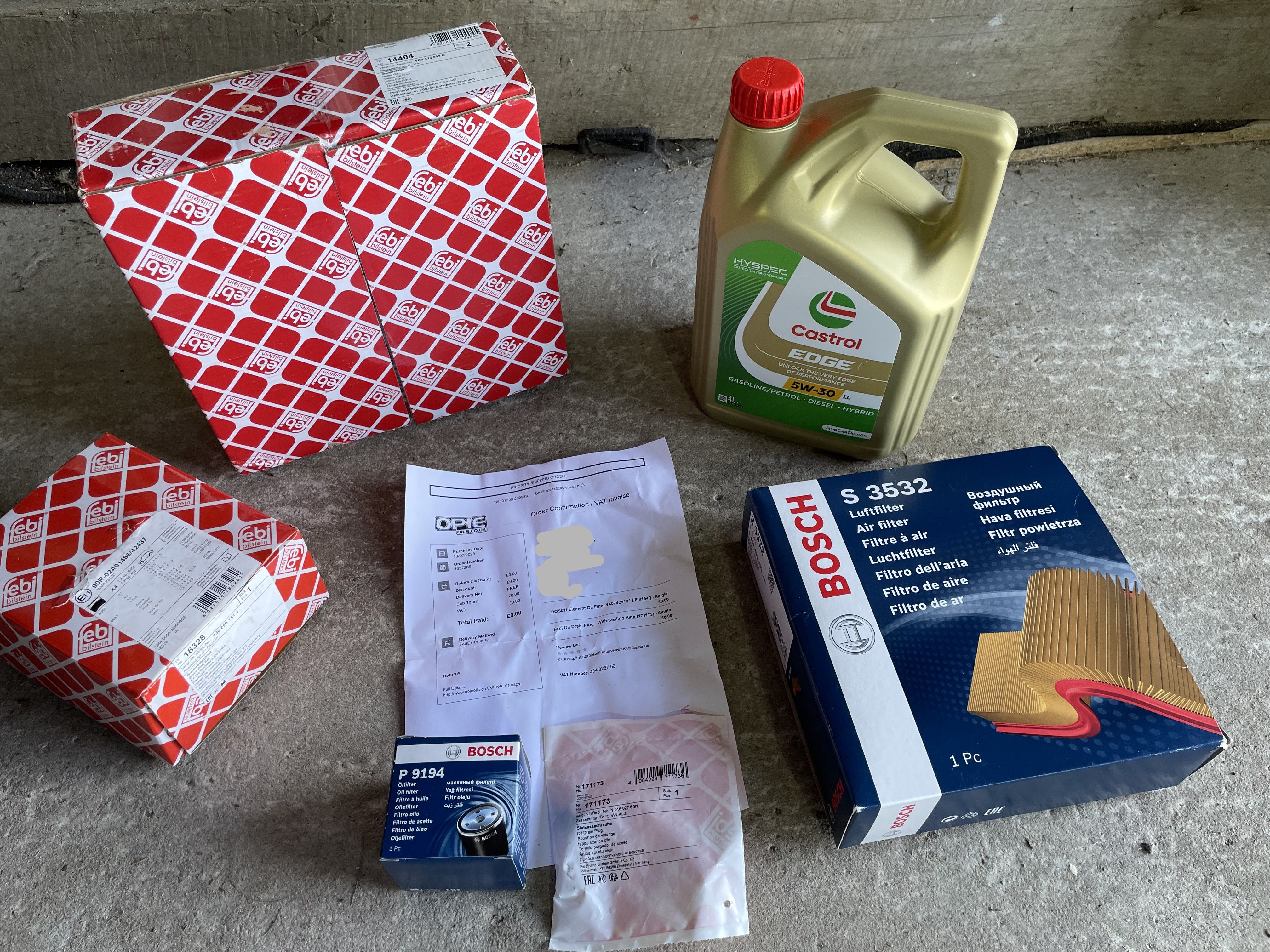 The front brakes had recently started to rumble a little with longer braking. Peeking through the spokes they seemed to be lipped and a bit crusty so I ordered some Febi Bilstein discs and pads (Amazon of all places were cheaper than Autodoc etc. and deliver what you order next day) for just over £50. So along with the 4l Castrol (£35 - also Amazon, and Bosch air filter - £10 from the same) it was a cheap service and brake change for under £100. I already had the Bosch oil filter and Febi drain plug from last year (which were mistakenly sent in lieu of the Porsche ones I ordered from Opie - they said to keep them rather than return, so thanks Opie!).