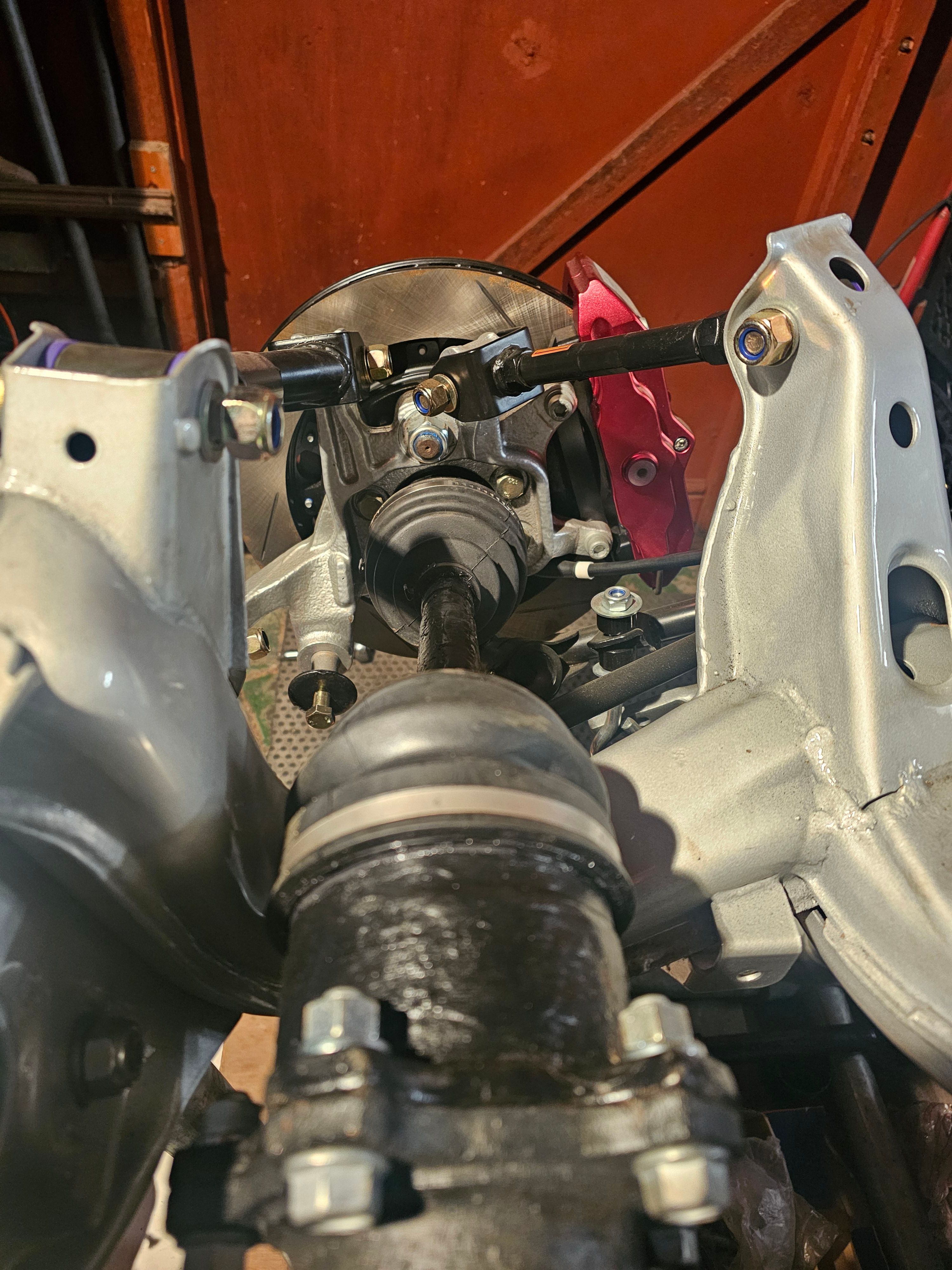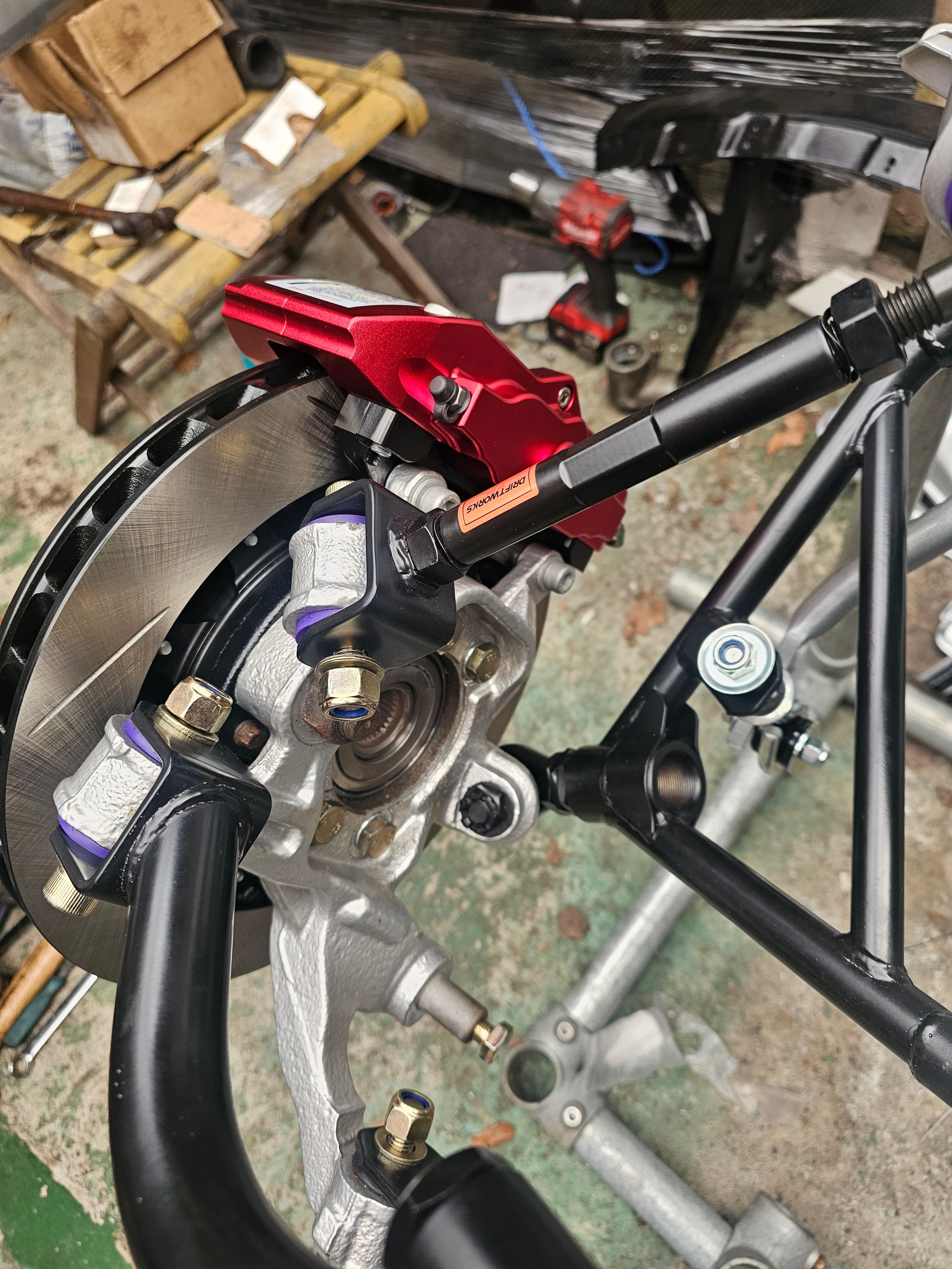 Rear brake test fit and new suspension arms sourced from Driftworks.