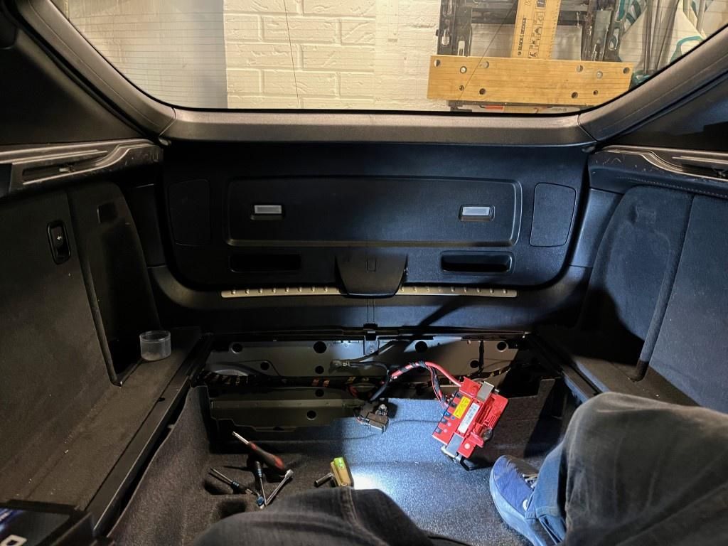 Luckily had the foresight to remove the boot floor etc before it went in the garage, as no access to the boot when tight up to the wall. So all work via the back seat.