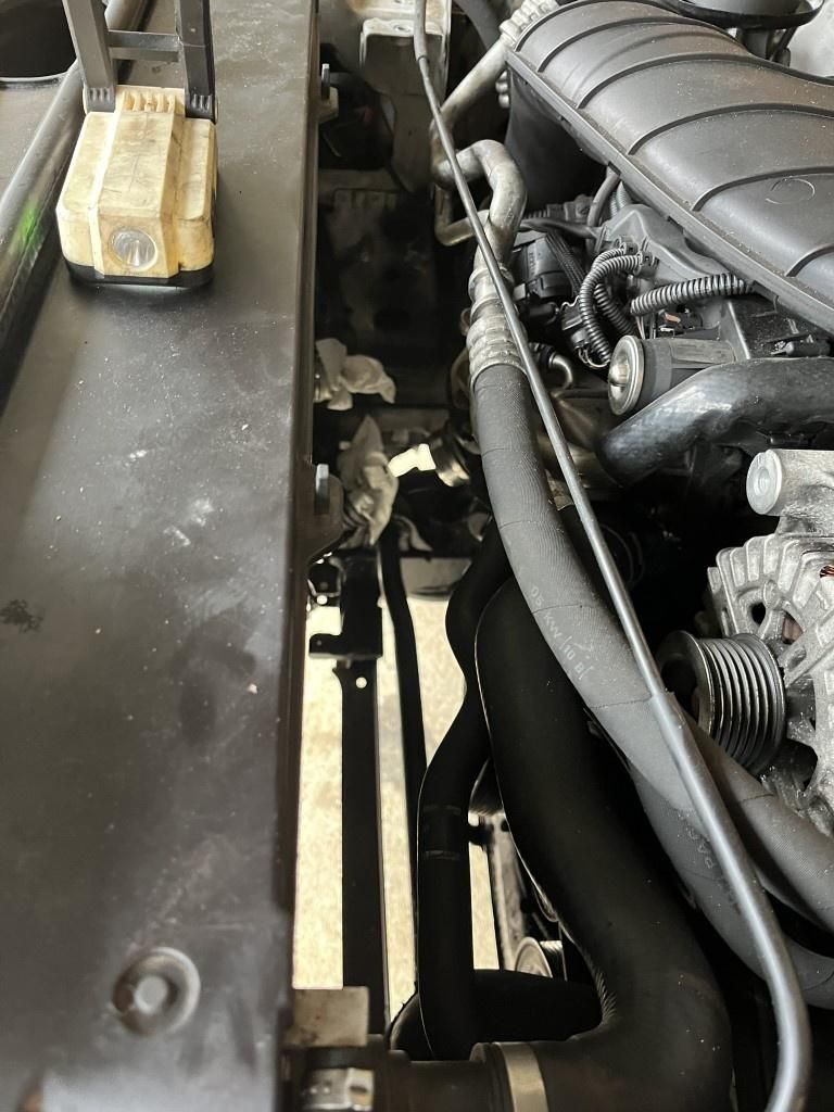 The alternators on the top of the engine, so access should be easy - but the tensioner is in the middle, so the fan has to come out to make space to get at it.