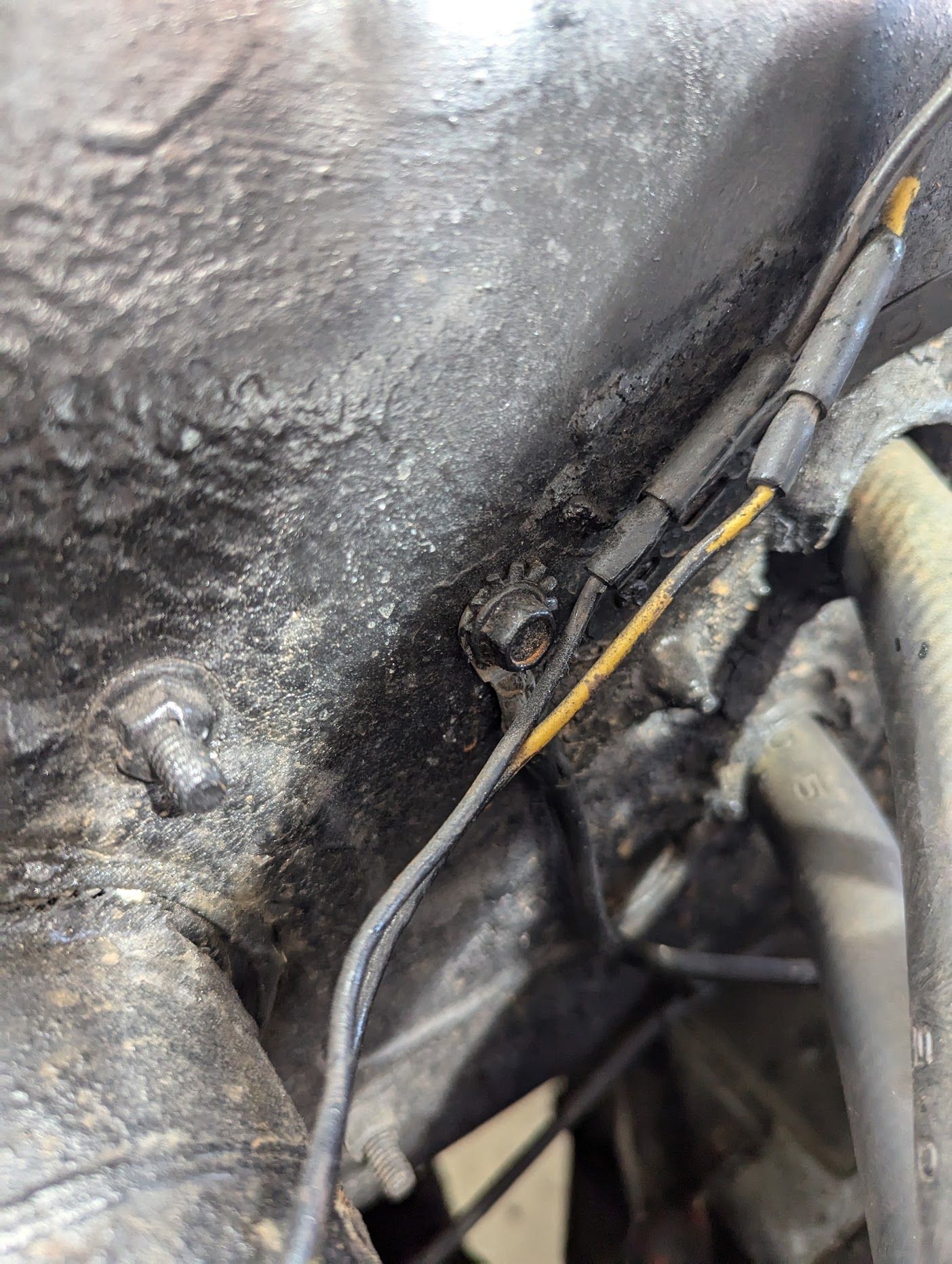 I started with the ground connections and there is a key one between the engine and firewall, it's shagged. Not only is the connector covered in crust the wire itself is also torn.