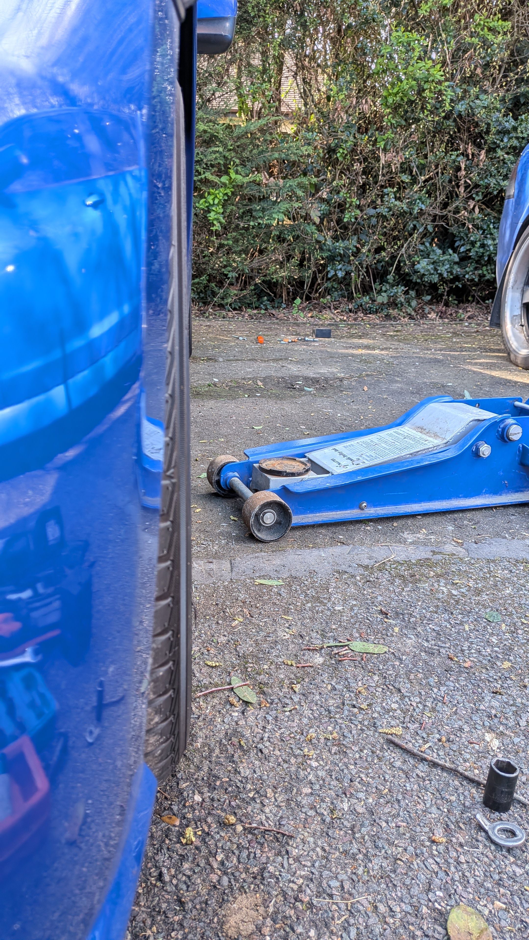 Didn't fancy pulling the quickjacks out for a couple of bolts, so thought I'd use the factory jacking point on the front subframe. Naturally, the jack doesn't fit under the chin far enough to reach it.