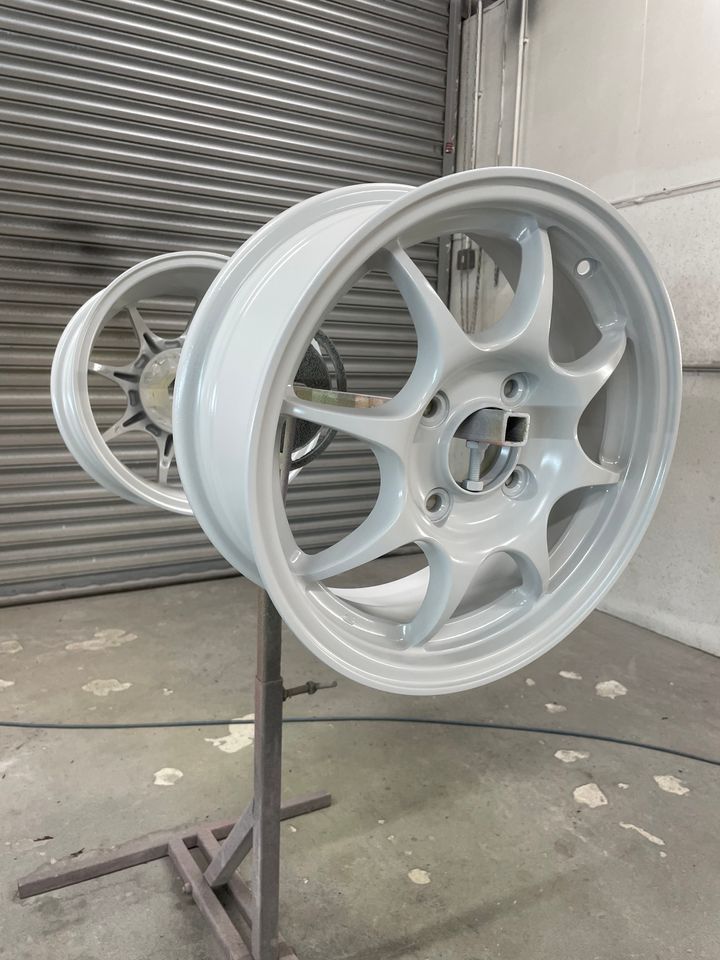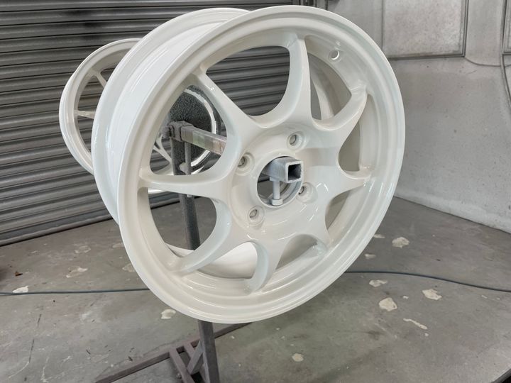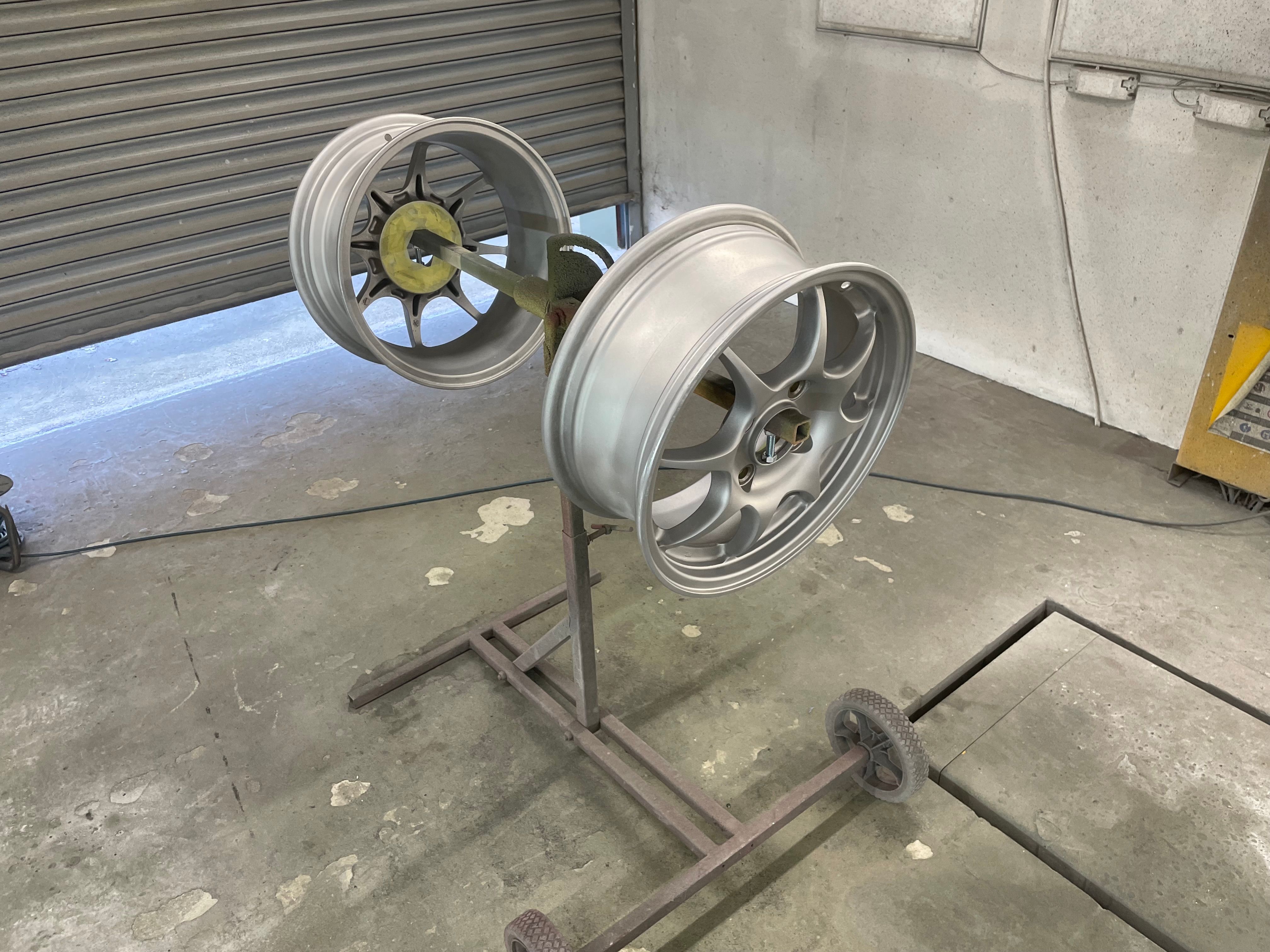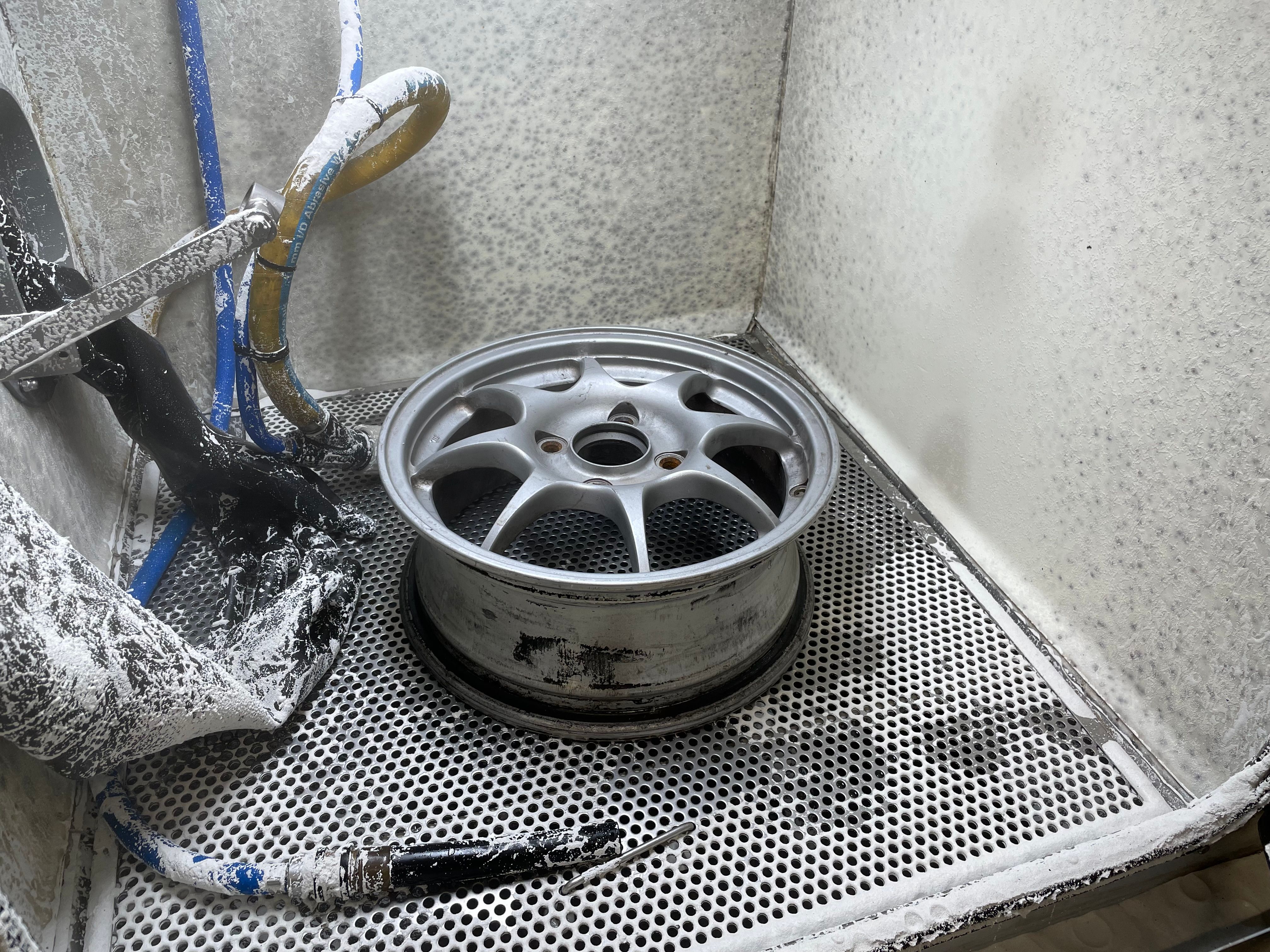 I vapour blasted the rims as they had been painted in aerosol, best to start from bare metal.