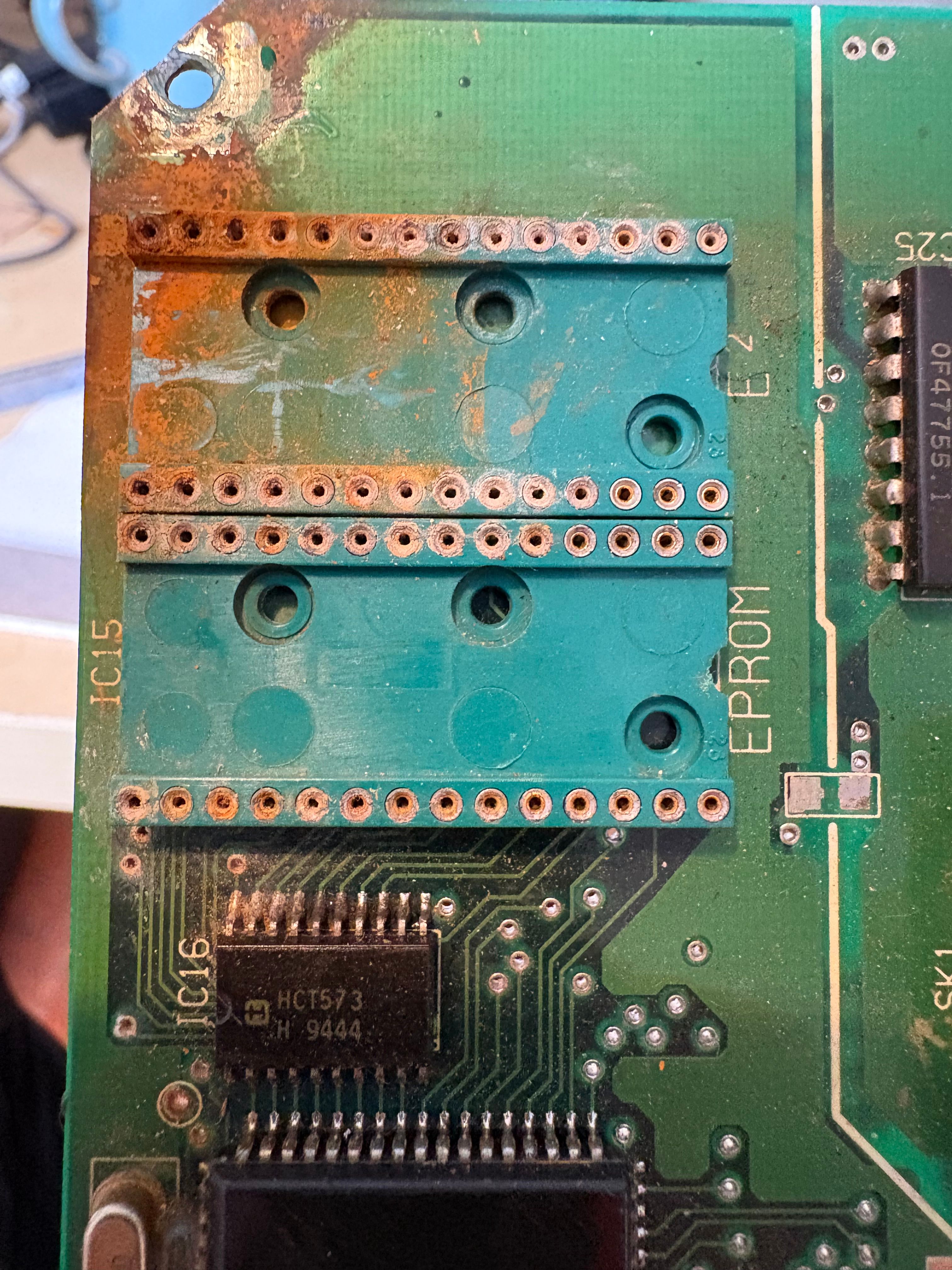However, as can be seen water has attacked the sockets for the nvram and eprom. Given this is for a car anybody have recommendations for replacement sockets?