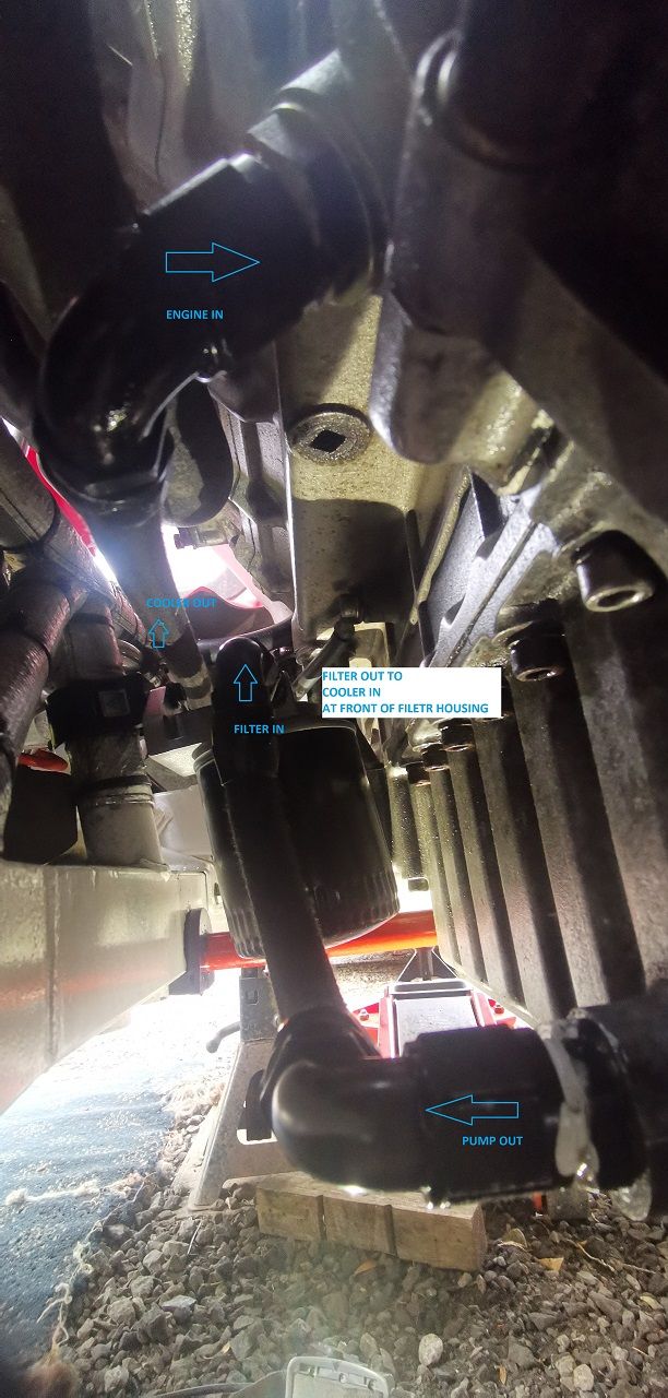 As you can see "normal" flow is from the left which indicates that the oil comes from the cooler to the filter which is the wrong way round. You can see from the attached hose (which was pump output) that it's going in through the out door on the housing - which gives you filter then cooler but wrong way through the filter.