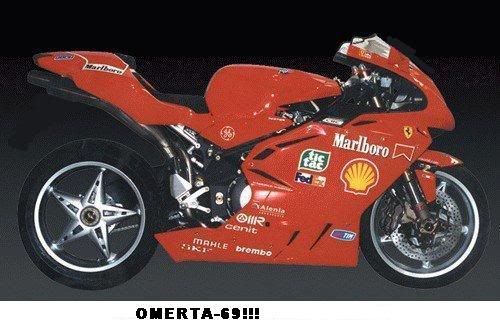 In the first picture you will See one of two official ferrari commissioned MV Agusta F$s. Asked to be built by MV agusta president Geovanni Castiglioni,Luca whos personal friend is Luca montezemolo who is the president of Ferrari. They were built to commemorate Schumacher's first F1 world championship win for Ferrari in 99. One went to F1 driver Micheal Schumacher and one to Castiglioni.