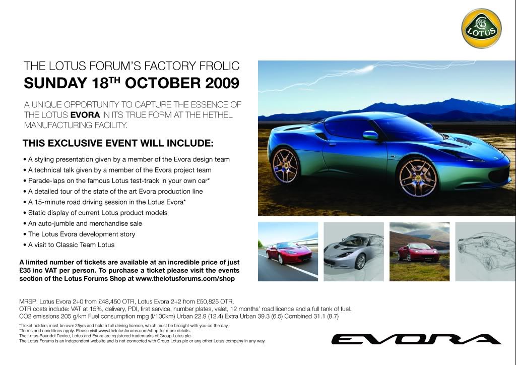 Sunday 18th October - En masse Lotus convoy to the Lotus Factory where we'll enjoy a great day. Events will include; Track 'parade' laps in your car, road drive in an Evora (every person can have a go!), Factory Tours, shop visit, ASO auto jumble, styling talks from Russell Carr/Steve Crijns, technical talks from Rob Savin/Roger Becker, Evora track demonstration laps, Classic Team Lotus cars, Evora development story, Lotus product displays, Lotus Sport and more. Lunch will be included and there will be beauticians on site to offer treatments to those not quite so interested in the cars, a family event! Lotus goodie bags for all attendees and more!